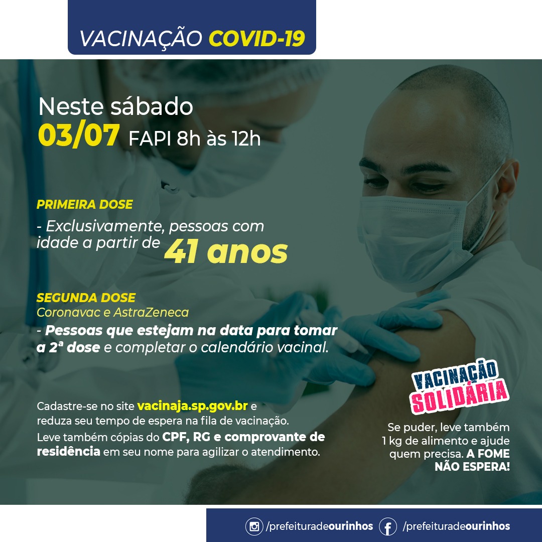 Após muitas reclamações de que a vacinação contra a Covid-19 em Ourinhos estava demorando para avançar no público geral, a Prefeitura anunciou na noite desta sexta-feira, 2, que vai vacinar neste sábado, 3, pessoas de 41 anos ou mais. Também será aplicada a 2ª dose, tanto da CoronaVac, como da AstraZenca. A vacinação acontece a partir das 8h até às 12h, na Fapi.