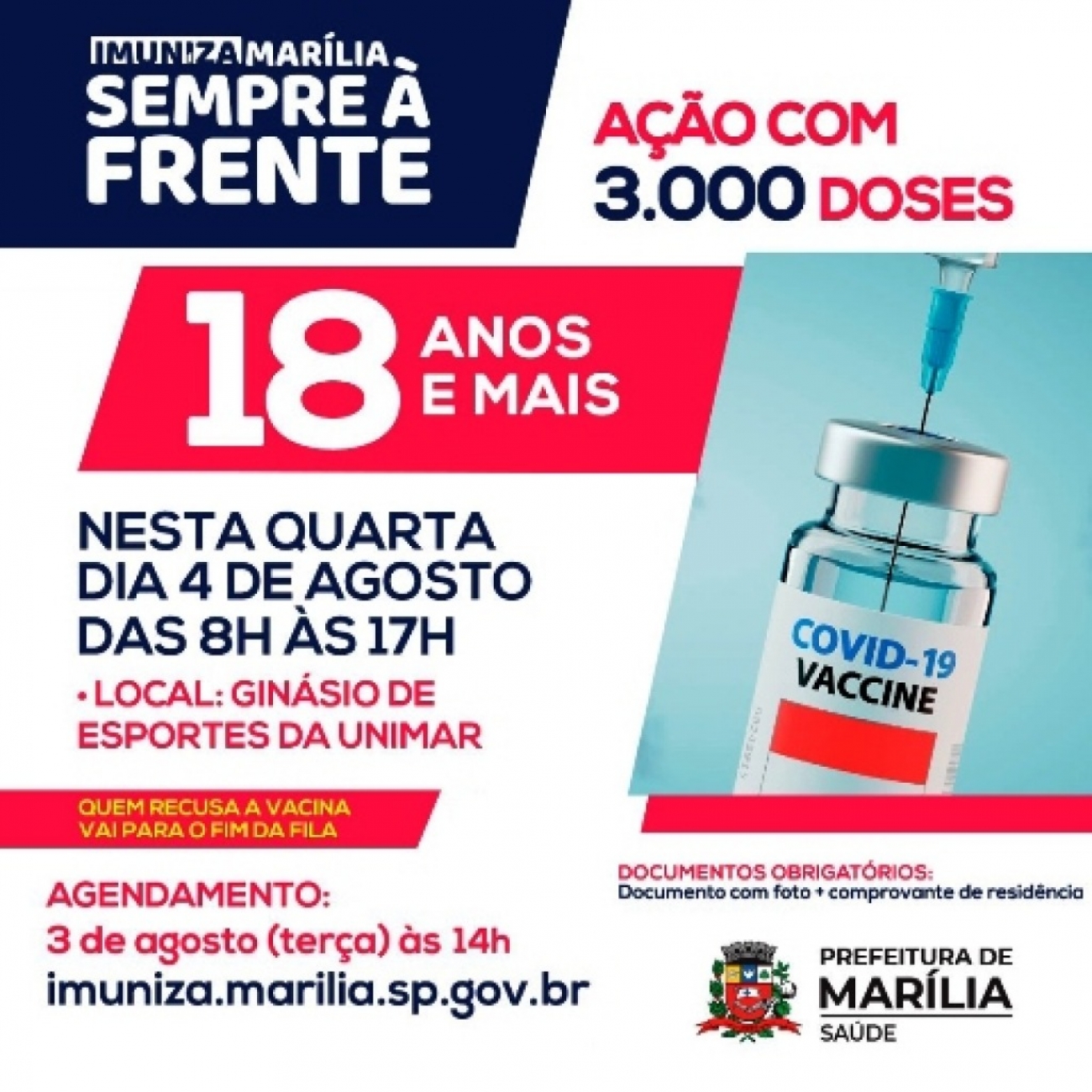 O atendimento será feito no ginásio de esportes da Unimar (Universidade de Marília), das 8h às 17h, com a disponibilização total de 3.000 doses. As pessoas deverão fazer o agendamento através do link oficial.