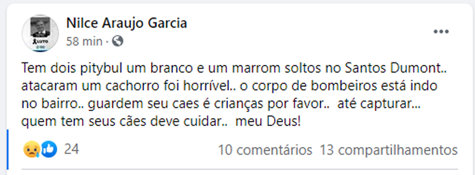 “Tem dois pitybull um branco e um marrom soltos no Santos Dumont.. atacaram um cachorro foi horrível. o corpo de bombeiros está indo no bairro.. guardem seu caes é crianças por favor.. até capturar... quem tem seus cães deve cuidar.. meu Deus!”