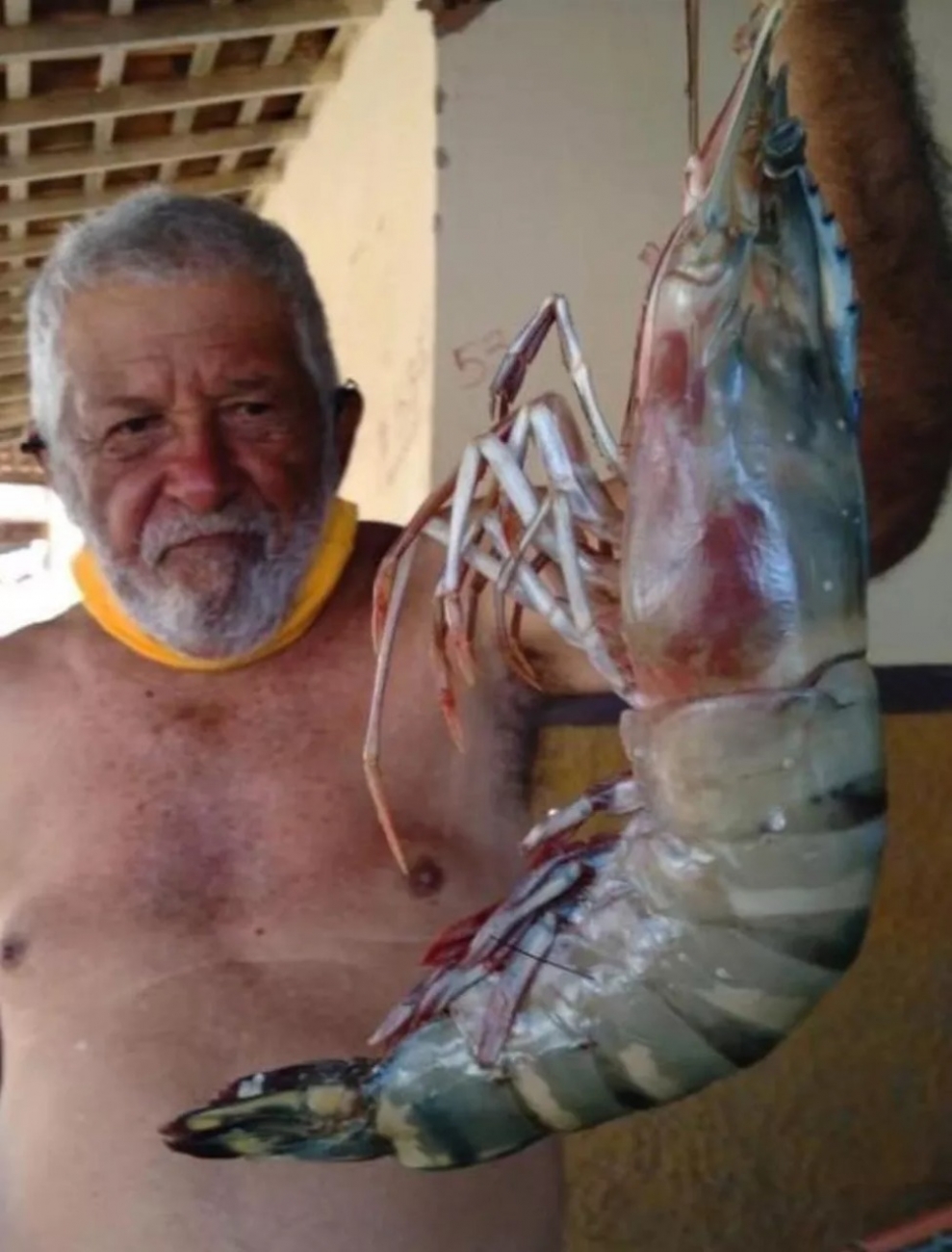 O camarão foi pesado e tem exatamente 408g. O homem conta que a foto foi registrada para ninguém dizer que é "história de pesca