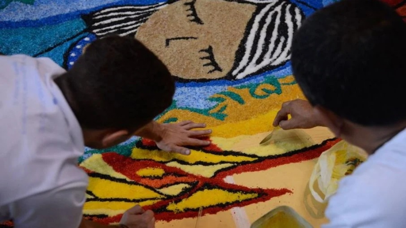 Confecção dos tapetes de sal de Corpus Christi na Catedral Metropolitana no centro da cidade