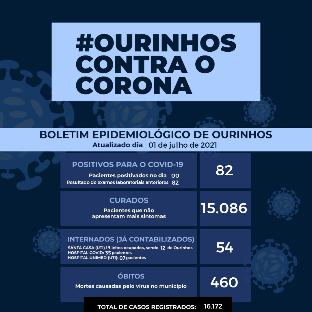 BOLETIM CORONAVÍRUS - Atualizado em 01 de julho de 2021A Secretaria Municipal de Saúde de Ourinhos registrou 82 novos casos de COVID-19 nesta quinta-feira (01), sendo todos resultados de dias anteriores.