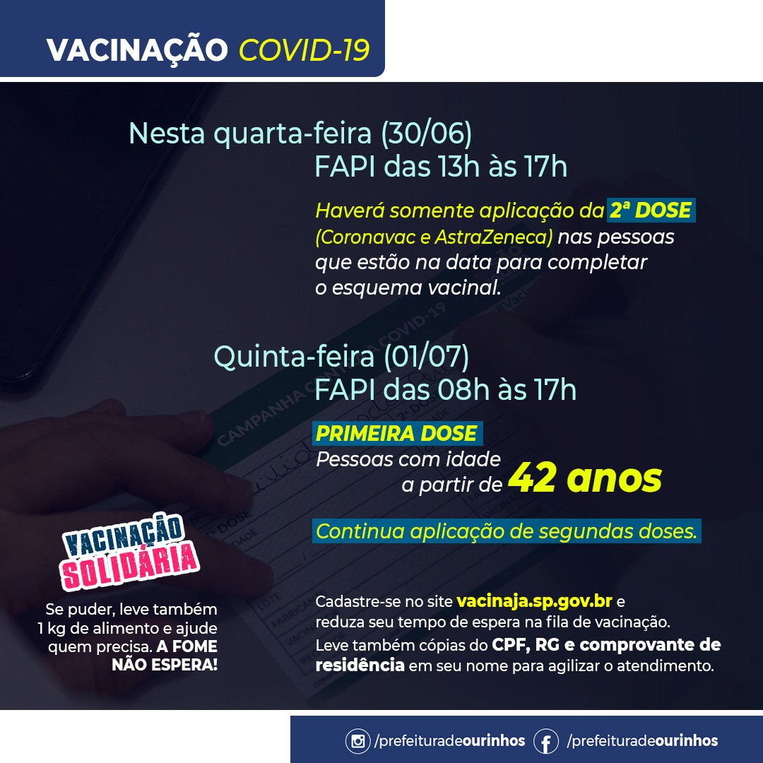 A Prefeitura de Ourinhos divulgou, na noite desta terça-feira, 29, que vai paralisar mais uma vez a aplicação da 1ª dose da vacina contra a Covid-19, mas manterá a vacinação da 2ª dose, nesta quarta-feira, 30. A aplicação da 1ª dose será retomada com pessoas de 42 anos do grupo geral, na quinta-feira, 1º de julho, conforme o banner divulgado: