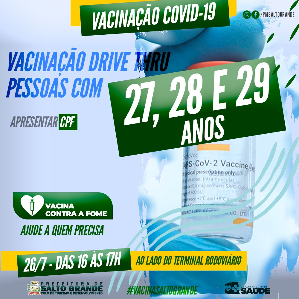 O Departamento de Saúde de Salto Grande imuniza com a primeira dose contra a Covid-19 nesta segunda-feira, 26, pessoas com idades de 27, 28 e 29 anos e as que ainda não tomaram a 1º dose do imunizante.