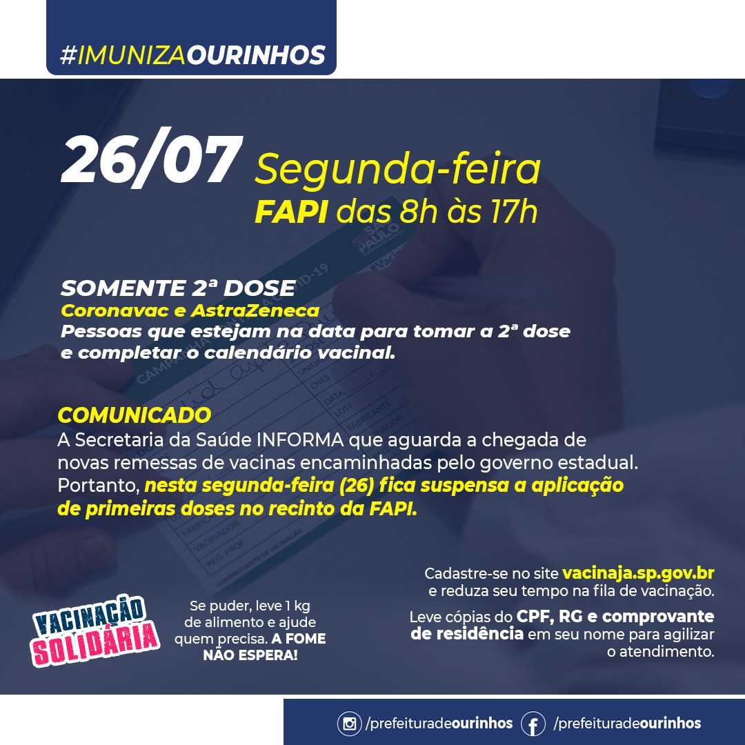 Nesta segunda-feira, 26, a Prefeitura de Ourinhos fará aplicação apenas em pessoas que estão na hora de receber a segunda dose d vacina contra a Covid-19. A retomada da aplicação da primeira dose fica na dependência da chegada de mais vacinas. A vacinação será das 8h às 17h, no recinto da Fapi.
