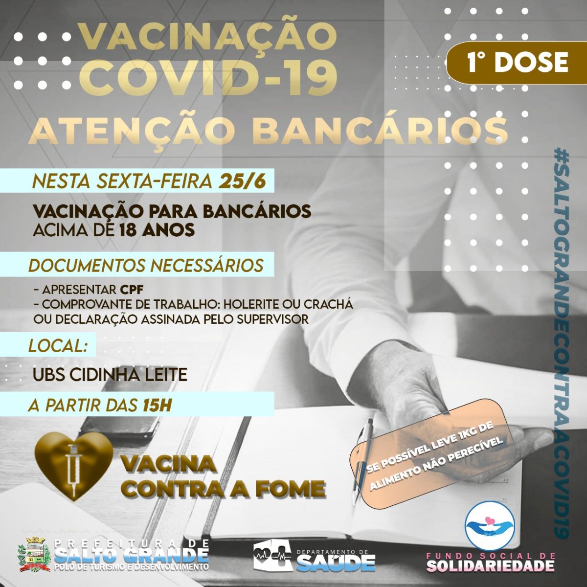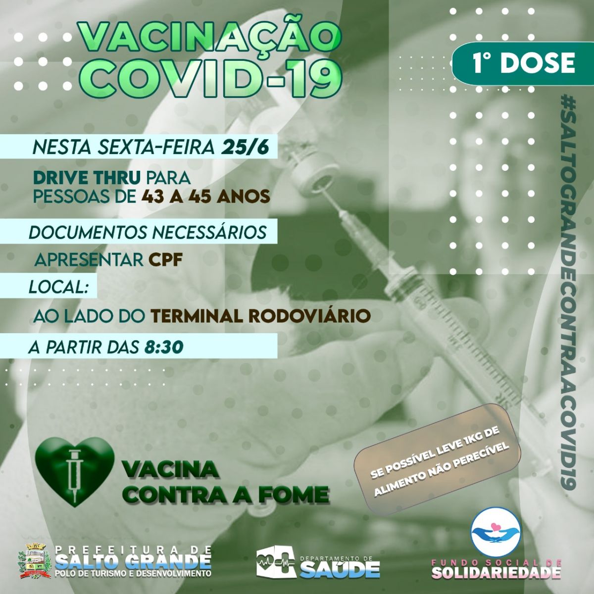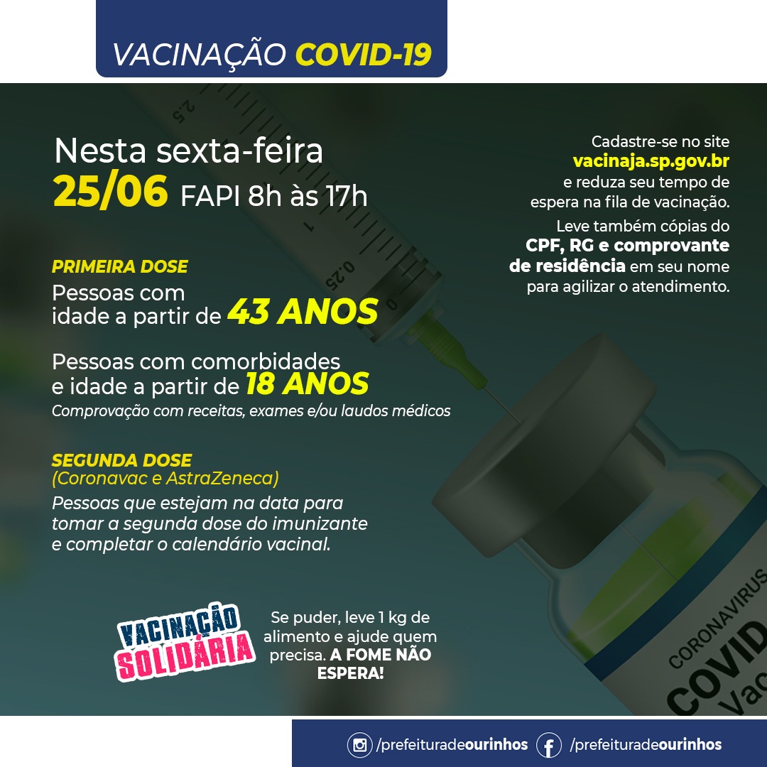 As Prefeituras de Ourinhos e Salto Grande vão iniciar nesta sexta-feira, 24, a vacinação contra a Covid-19 em pessoas, com 43 anos ou mais, do grupo geral (sem comorbidade). Ourinhos mantém a vacinação de pessoas com comorbidades a partir dos 18 anos e Salto Grande também vai aplicar o imunizante em bancários, a partir dos 18 anos. Confira os banners: