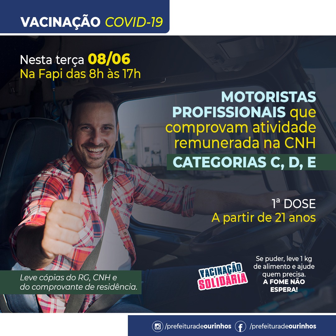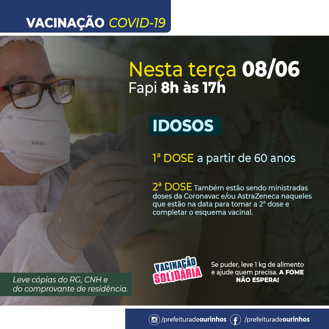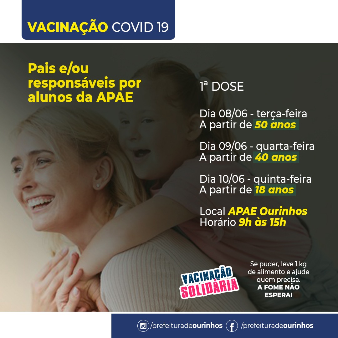 A prefeitura de Ourinhos começa a vacinar contra a Covid-19, nesta terça-feira, 8, pais ou responsáveis de alunos da APAE e motoristas das categorias C, D e E. Também será mantida a idade de idosos a partir dos 60 anos e segunda dose, tanto da CoronaVac, como da AstraZeneca. Confira os banners abaixo. Se atente para o local, os pais e responsáveis dos alunos da APAE serão vacinados na sede da APAE local, das 9h às 15h, já os serão na FAPI das 8h às 17h.