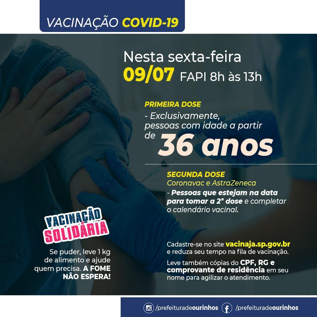 A Prefeitura de Ourinhos anunciou na tarde desta quinta-feira, 8, que vai vacinar nesta sexta-feira, 9, feriado, pessoas de 36 anos ou mais. Também será aplicada a 2ª dose, tanto da CoronaVac, como da AstraZenca. A vacinação acontece a partir das 8h até às 13h, na Fapi.