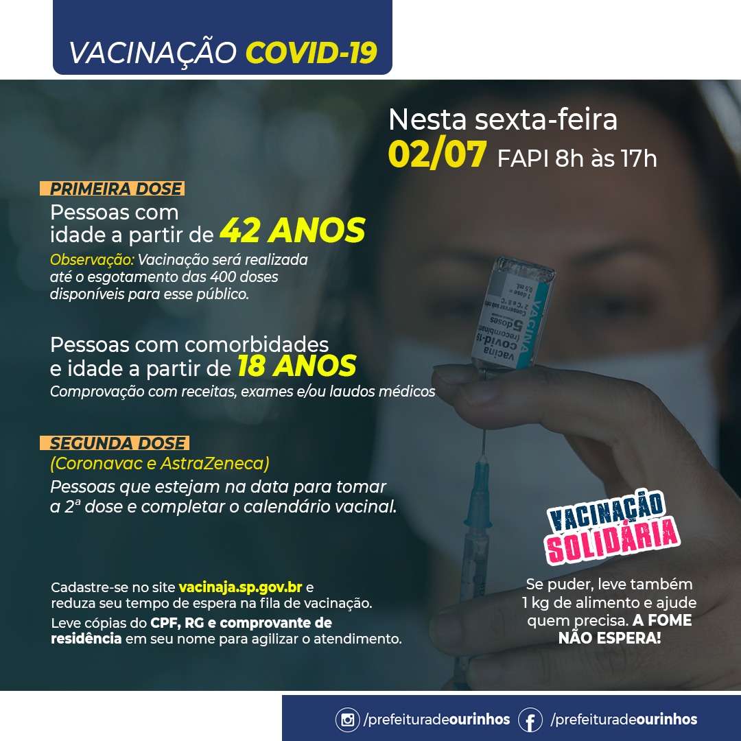 A Prefeitura de Ourinhos informou na noite desta quinta-feira, 1º, que a vacinação contra a Covid-19 será limitada a 400 doses para o público geral de 42 anos ou mais. Foco principal será na aplicação da 2ª dose e 1ª dose em pessoas com comorbidades a partir dos 18 anos. a vacinação acontece a partir das 8h, até às 17h, na FAPI.