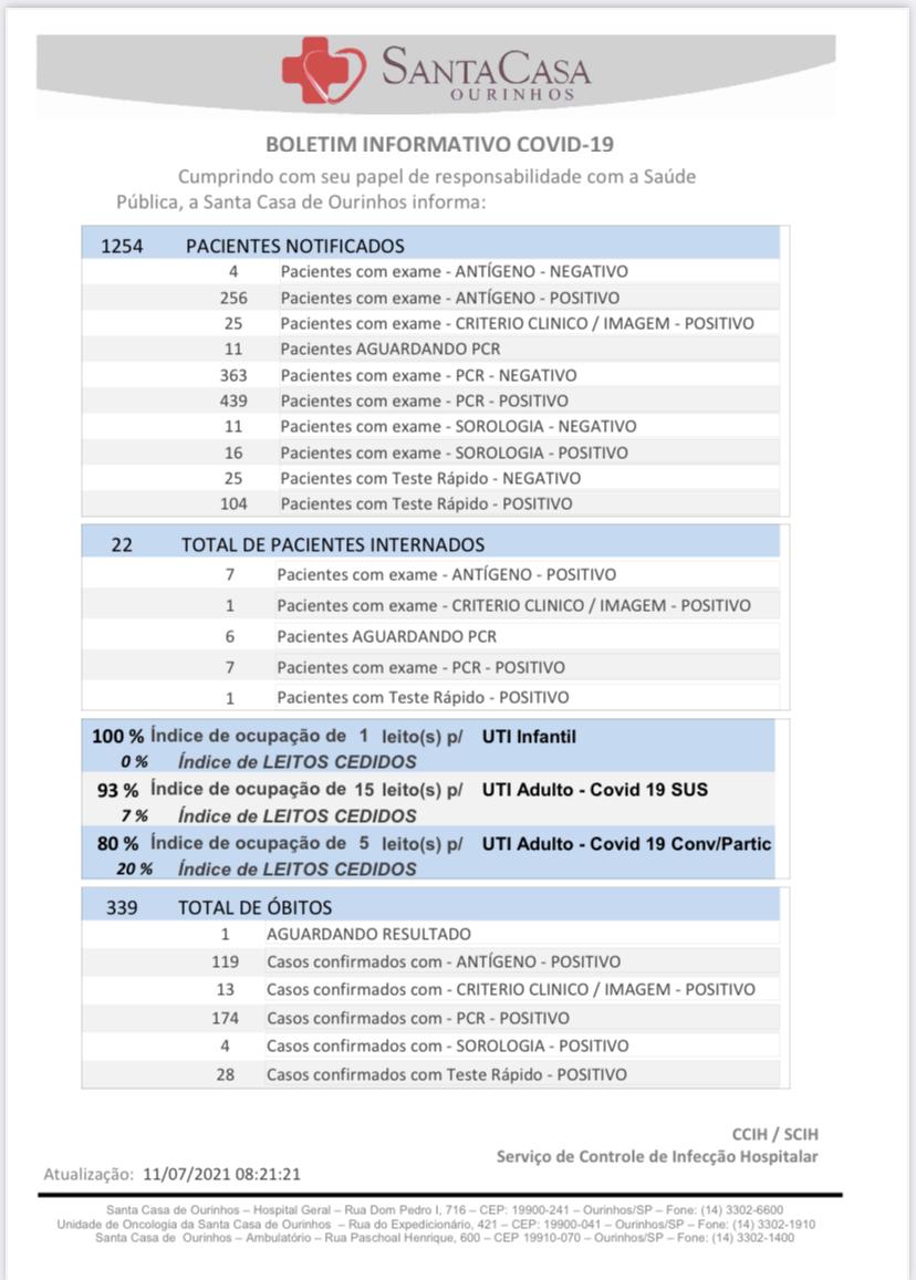 Em boletins divulgados neste domingo, 11, a Prefeitura de Ourinhos e a Santa Casa de Misericórdia de Ourinhos, não registram a ocorrência de nenhum óbito na cidade e no hospital, em decorrência da Covid-19. Enquanto o município apresenta 474 óbitos, desde o início da pandemia, a Santa Casa chegou ao número de 339 mortes.