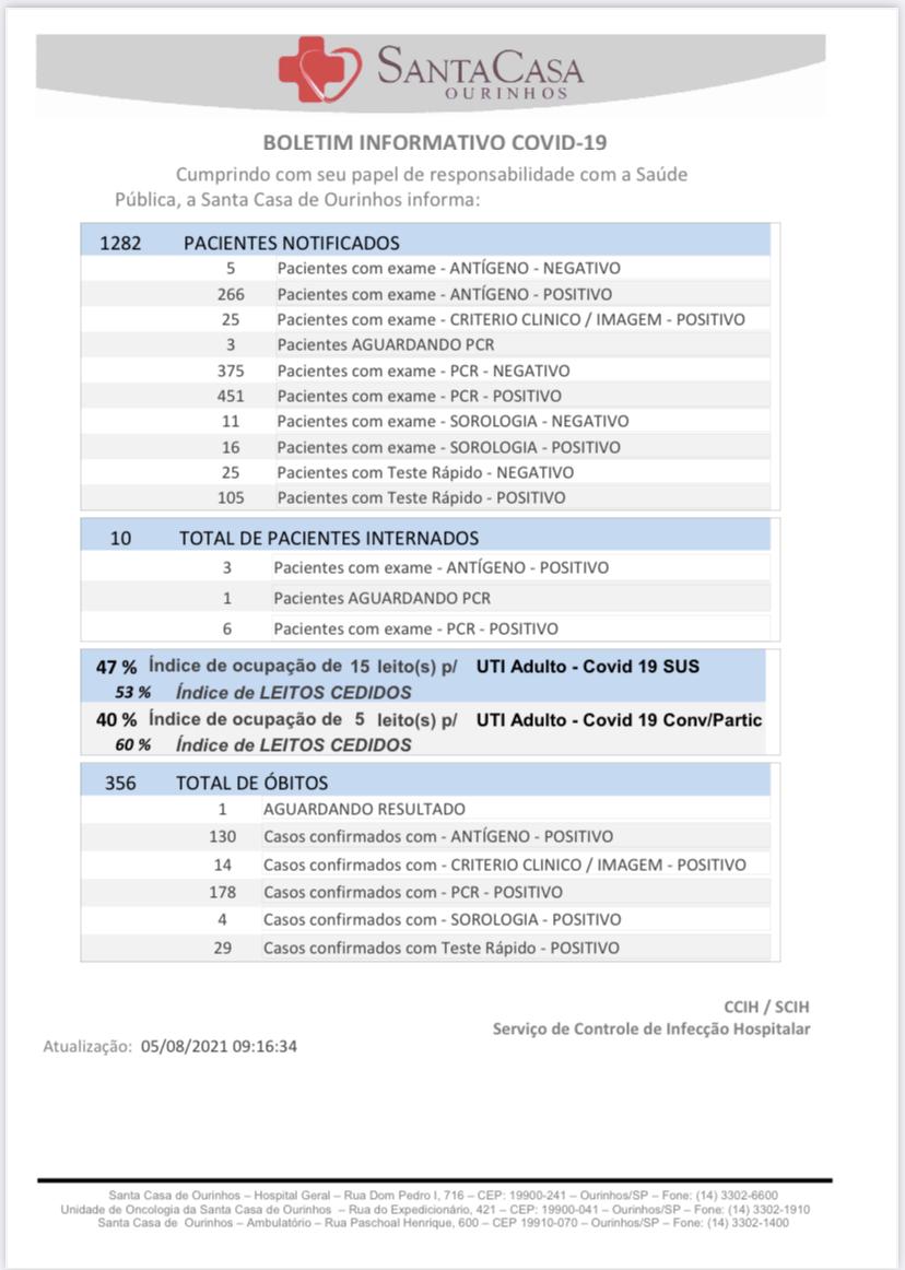 O hospital chegou ao número de 356 mortes desde o início da pandemia, somente no hospital, que atende toda a região, portanto não são pacientes apenas moradores de Ourinhos, porém em sua grande maioria pertence ao município. A Prefeitura de Ourinhos, informou até esta última quarta-feira, 4, 501 óbitos de moradores residentes na cidade.