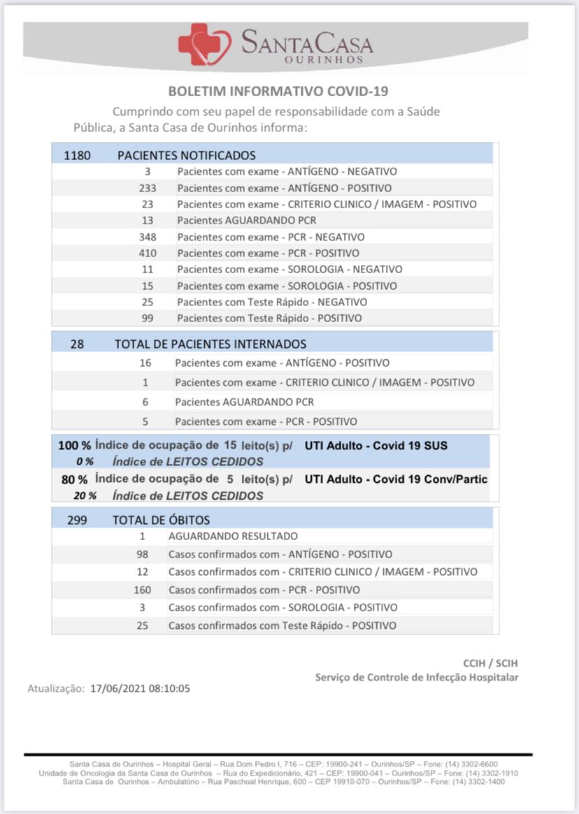 Em boletim divulgado, na manhã desta quinta-feira, 17, a Santa Casa de Misericórdia de Ourinhos informou o registro de mais dois óbitos no hospital em decorrência da Covid-19 (pacientes homens de Ourinhos e Santa Cruz do Rio Pardo) e chegou ao número de 299 mortes desde o início da pandemia.