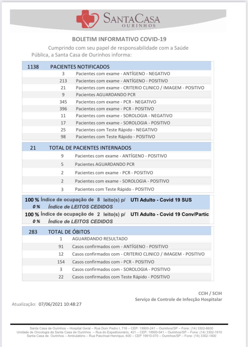 Em boletim divulgado, na manhã deste segunda-feira, 7, a Santa Casa de Misericórdia de Ourinhos informou o registro de mais três óbitos no hospital em decorrência da Covid-19, sendo todos de Ourinhos (2 homens e uma mulher) e chegou ao número de 283 mortes desde o início da pandemia. Se contar outros hospitais, Ourinhos até momento tem 368 mortes, de acordo com a última atualização da Prefeitura de Ourinhos, feita com números de ontem (6), sem incluir os óbitos de hoje da Santa Casa.
