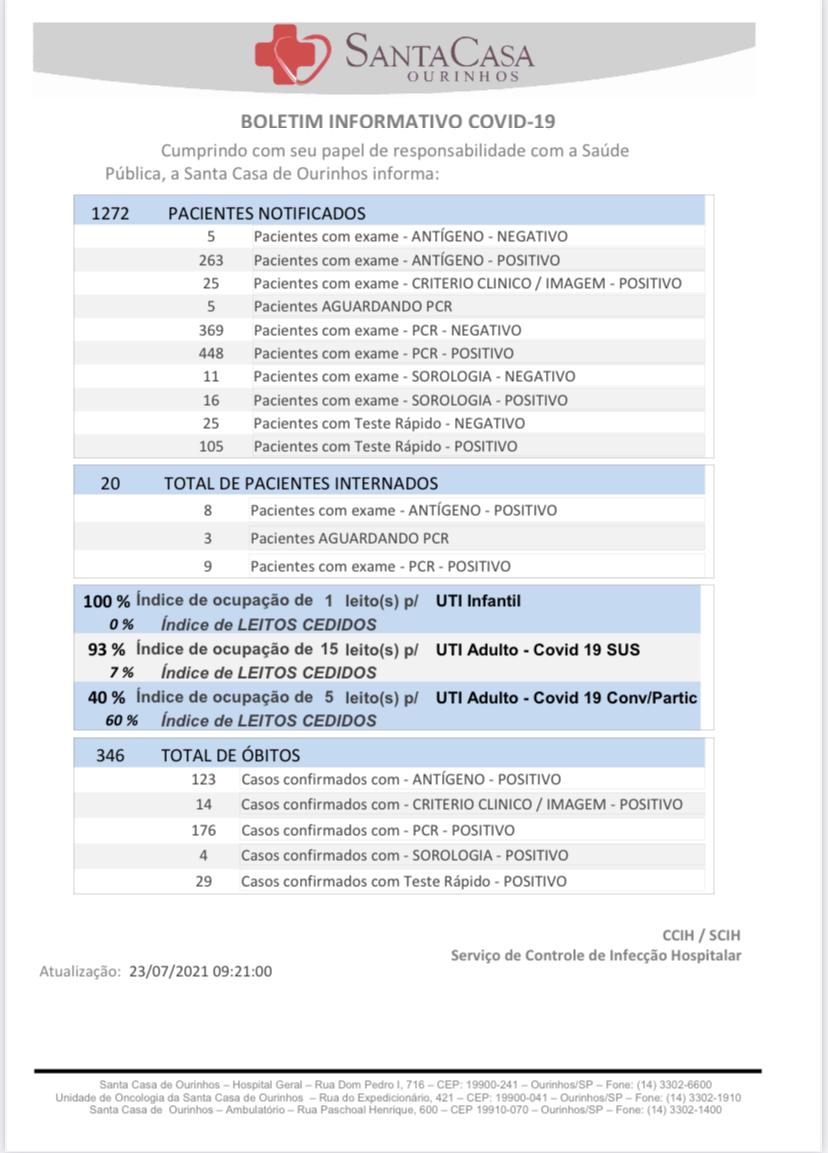 A Santa Casa de Misericórdia de Ourinhos informou, na manhã desta sexta-feira, 23, o registro de mais um óbito no hospital em decorrência da Covid-19 (paciente de Ourinhos do sexo masculino) e chegou ao número de 346 mortes desde o início da pandemia, somente no hospital, que atende toda a região, portanto não são pacientes apenas moradores de Ourinhos, porém em sua grande maioria pertence ao município. A Prefeitura de Ourinhos já confirmou até hoje (23) 490 óbitos.