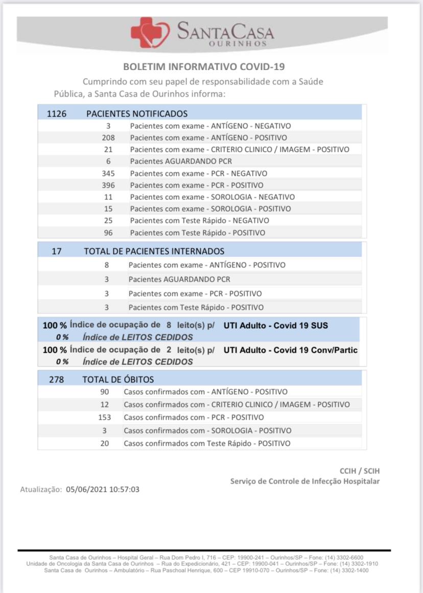 Em boletim divulgado, na tarde deste sábado, 5, a Santa Casa de Misericórdia de Ourinhos informou o registro de mais dos óbitos no hospital em decorrência da Covid-19 (os dois pacientes são de Ourinhos) e chegou ao número de 278 mortes desde o início da pandemia. Se contar outros hospitais, Ourinhos até momento tem 365 mortes, de acordo com a última atualização da Prefeitura de Ourinhos, feita com números de ontem (4), sem incluir os óbitos de hoje da Santa Casa.