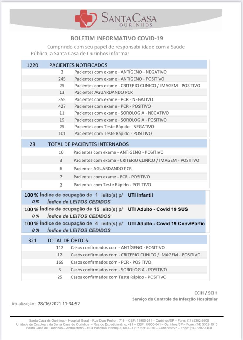 Em boletim divulgado, no começo da tarde desta segunda, 28, a Santa Casa de Misericórdia de Ourinhos informou o registro de mais dois óbitos no hospital em decorrência da Covid-19 (um homem e uma mulher residentes de Ourinhos) e chegou ao número de 321 mortes desde o início da pandemia. Com essa atualização da Santa Casa, Ourinhos já deveria informar a ocorrência de 452 óbitos, porém os números divulgados dão conta de 450.
