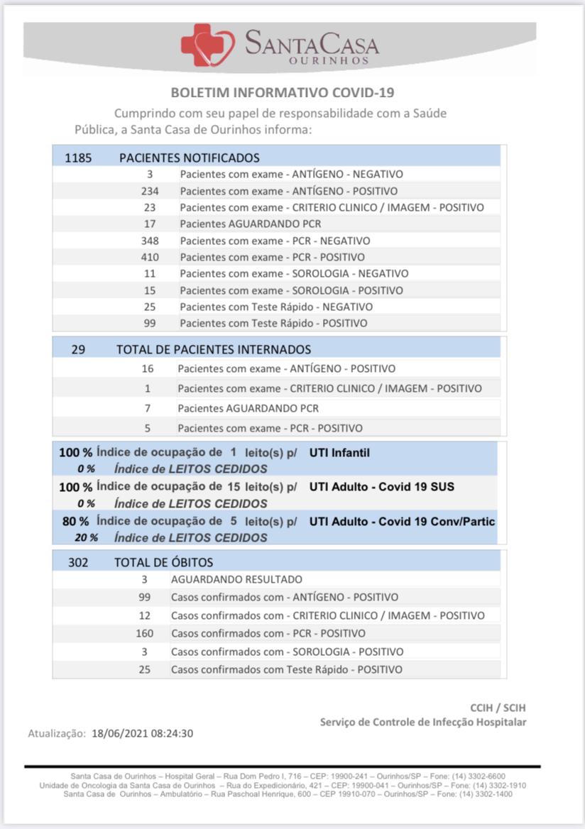 Em boletim divulgado, na manhã desta sexta-feira, 18, a Santa Casa de Misericórdia de Ourinhos informou o registro de mais três óbitos no hospital em decorrência da Covid-19 (dois homens e uma mulher, todos de Ourinhos) e chegou ao número de 302 mortes desde o início da pandemia. Com essa atualização da Santa Casa, Ourinhos já deveria informar a ocorrência de 425 óbitos, porém só deverá divulgar amanhã (19).