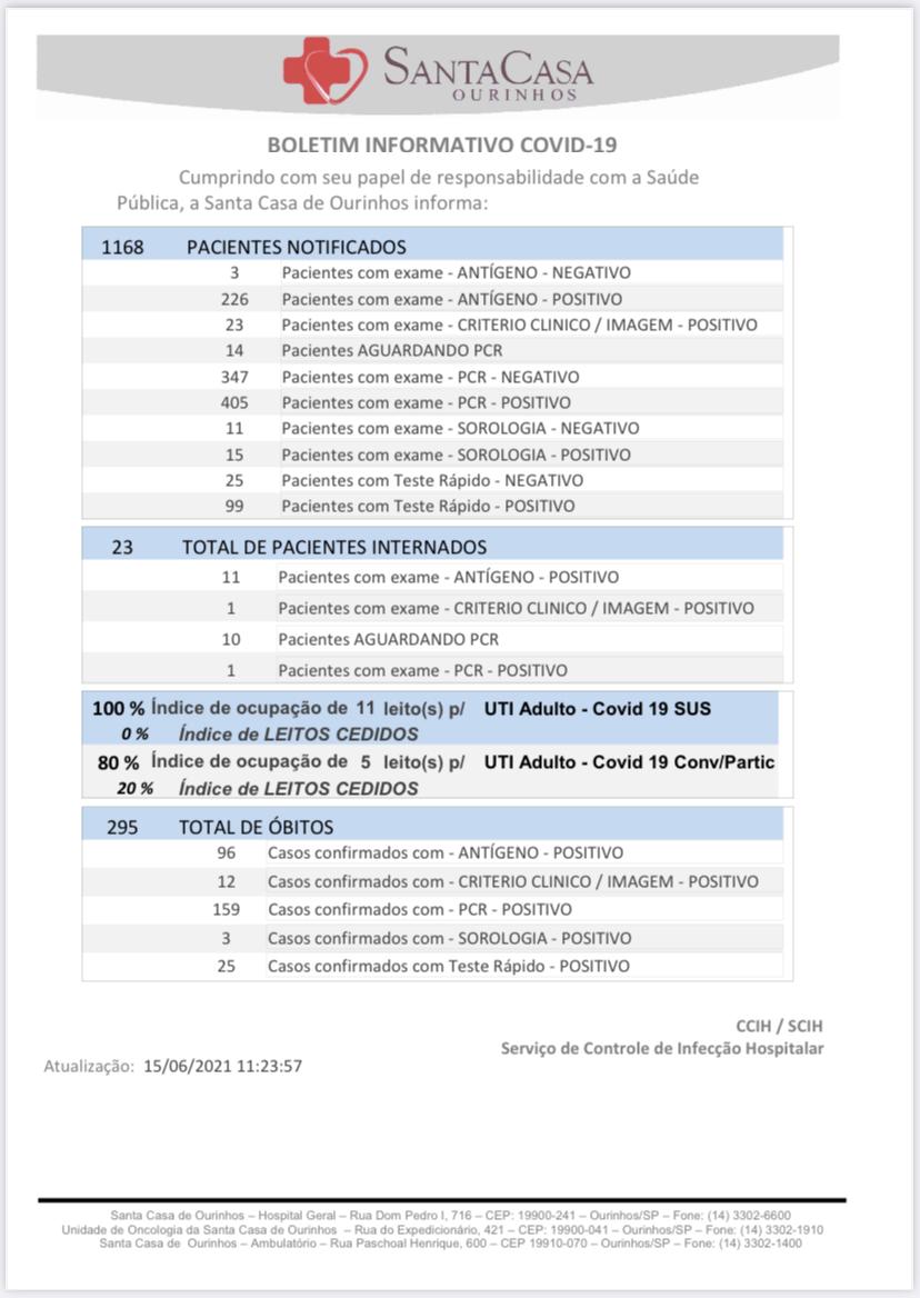 Em boletim divulgado, na manhã desta terça-feira, 15, a Santa Casa de Misericórdia de Ourinhos informou o registro de mais dois óbitos no hospital em decorrência da Covid-19 (2 pacientes homens de Ourinhos) e chegou ao número de 295 mortes desde o início da pandemia. Se contar outros hospitais, Ourinhos até momento tem 411 mortes, de acordo com a última atualização da Prefeitura de Ourinhos, feita com números de ontem (14), sem incluir os óbitos de hoje.
