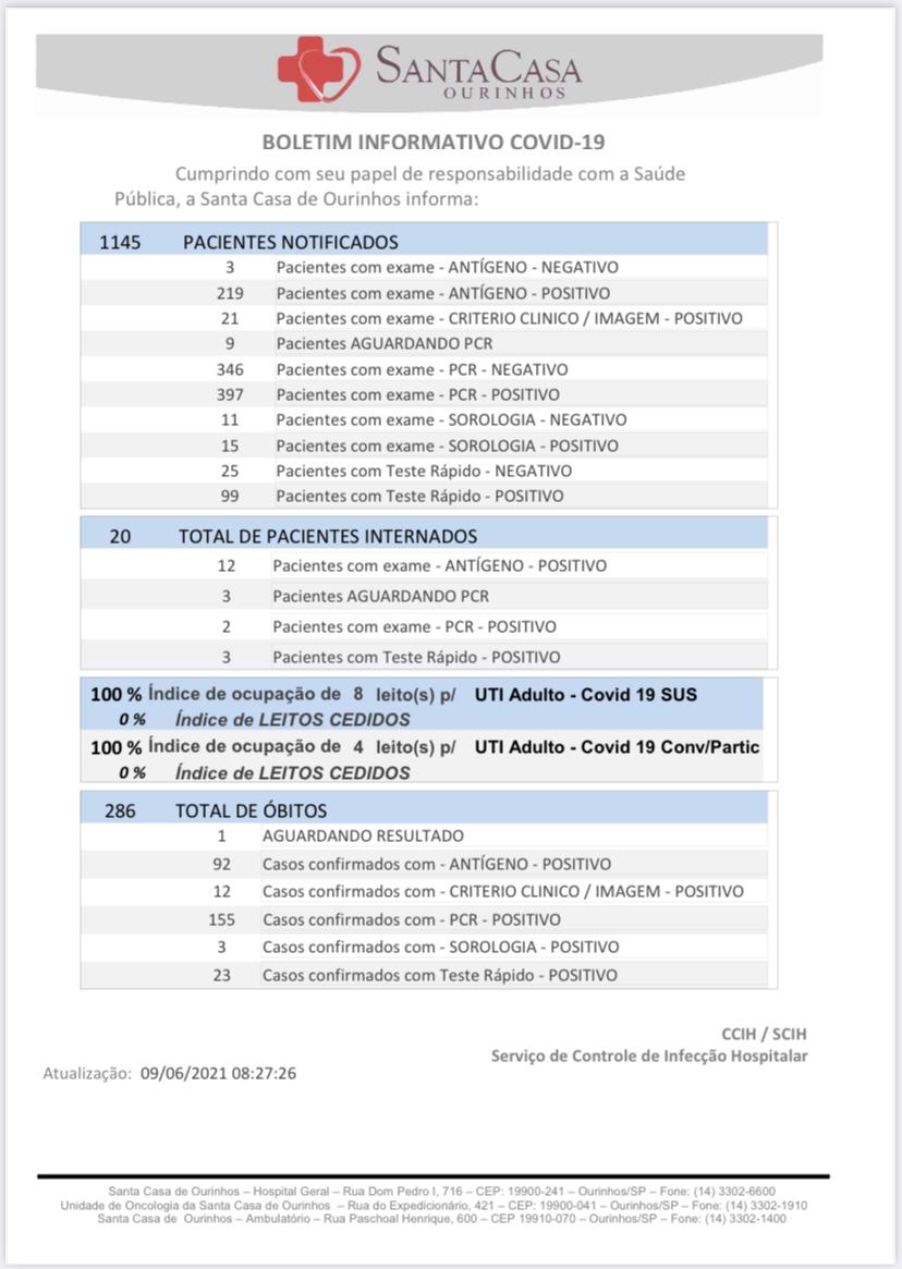 Em boletim divulgado, na manhã deste quarta-feira, 9, a Santa Casa de Misericórdia de Ourinhos informou o registro de mais um óbito no hospital em decorrência da Covid-19, sendo todos de Ourinhos (uma mulher) e chegou ao número de 286 mortes desde o início da pandemia. Se contar outros hospitais, Ourinhos até momento tem 386 mortes, de acordo com a última atualização da Prefeitura de Ourinhos, feita com números de ontem (8), sem incluir os óbitos de hoje.