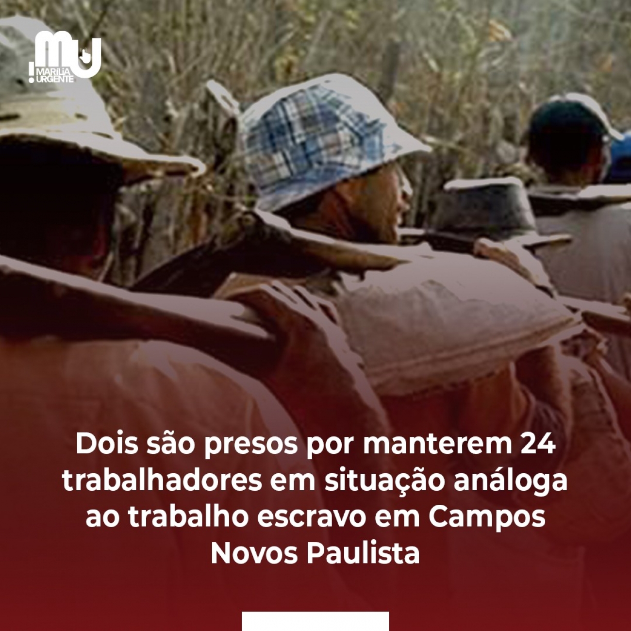 Dois homens foram presos em flagrante por manter 24 trabalhadores em situação de escravidão numa ação realizada pelo Ministério Público do Trabalho em um sítio em Campos Novos Paulista (cerca de 60 quilômetros de Marília).