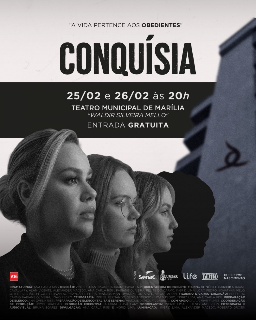 Ambientada em um futuro próximo, Conquísia apresenta uma sociedade que decide trocar o caos por uma ordem absoluta. A trama acompanha três mulheres inseridas em diferentes posições dentro desse sistema. Em meio a tensão e humor ácido, a peça mostra que certas escolhas não têm volta.