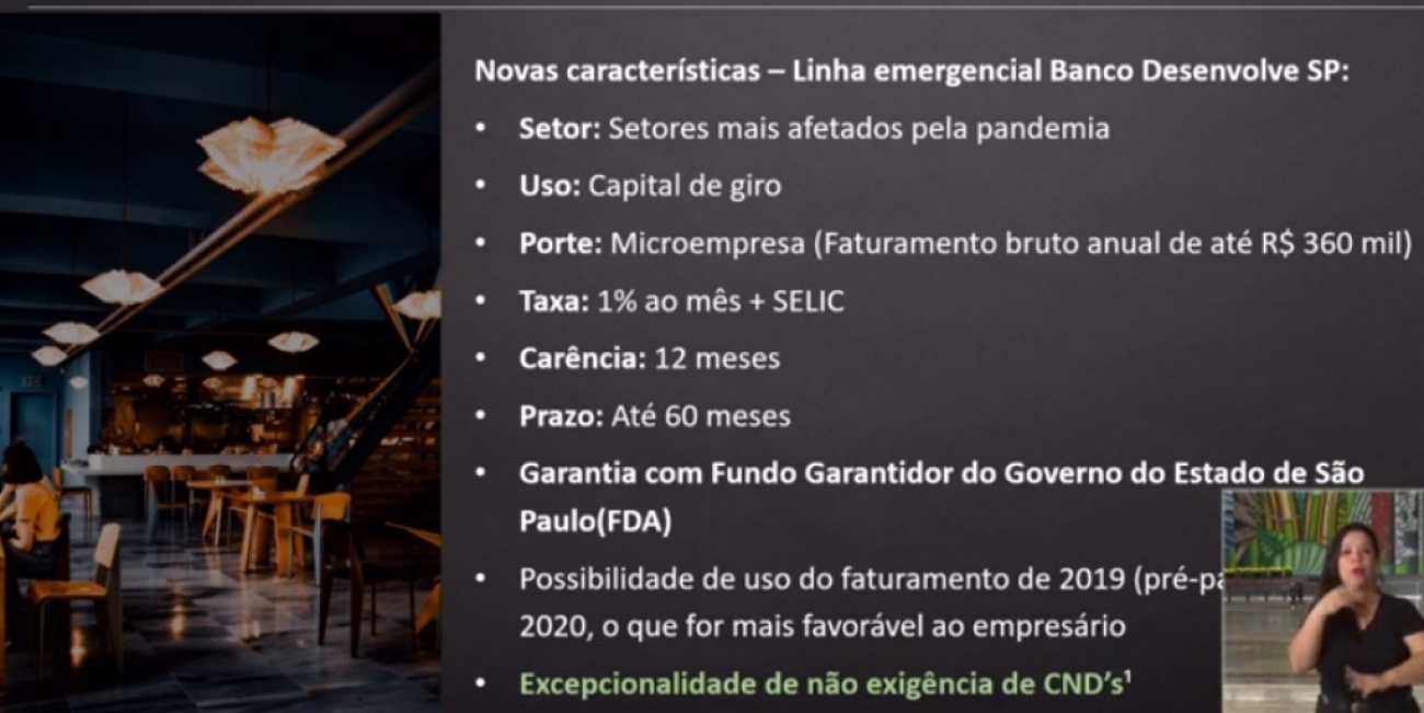 O Desenvolve SP e Banco do Povo, plataformas estaduais de financiamento dos recursos, vão oferecer limnhas com carência de até 12 meses, 60 meses para pagar e não haverá exigência da certidão negativa de débitos, que poderia afastar muitas empresas dos financiamentos.