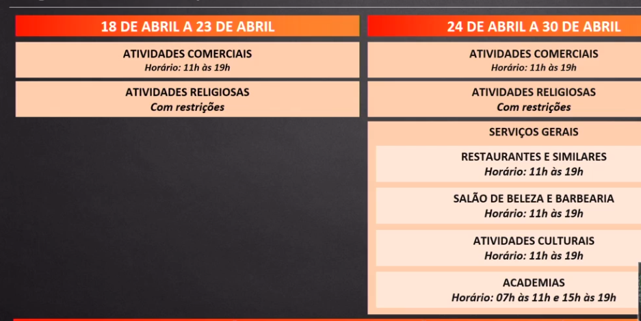 O horário de salões, restaurantes e atividades culturais também será das 11h às 19h. Academias poderão funcionar em dois turnos, das 7h às 11h e das 15h às 19h. O funcionamento de bares está proibido.