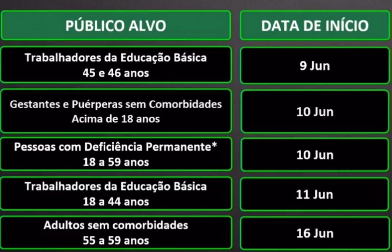 Vacinação antecipada para 360 mil profissionais da Educação na faixa etária a partir de 18 anos, que vai começar na sexta-feira, dia 11, prevista para acontecer em julho. A antecipação em relação ao programa oficial do Estado é de 40 dias.