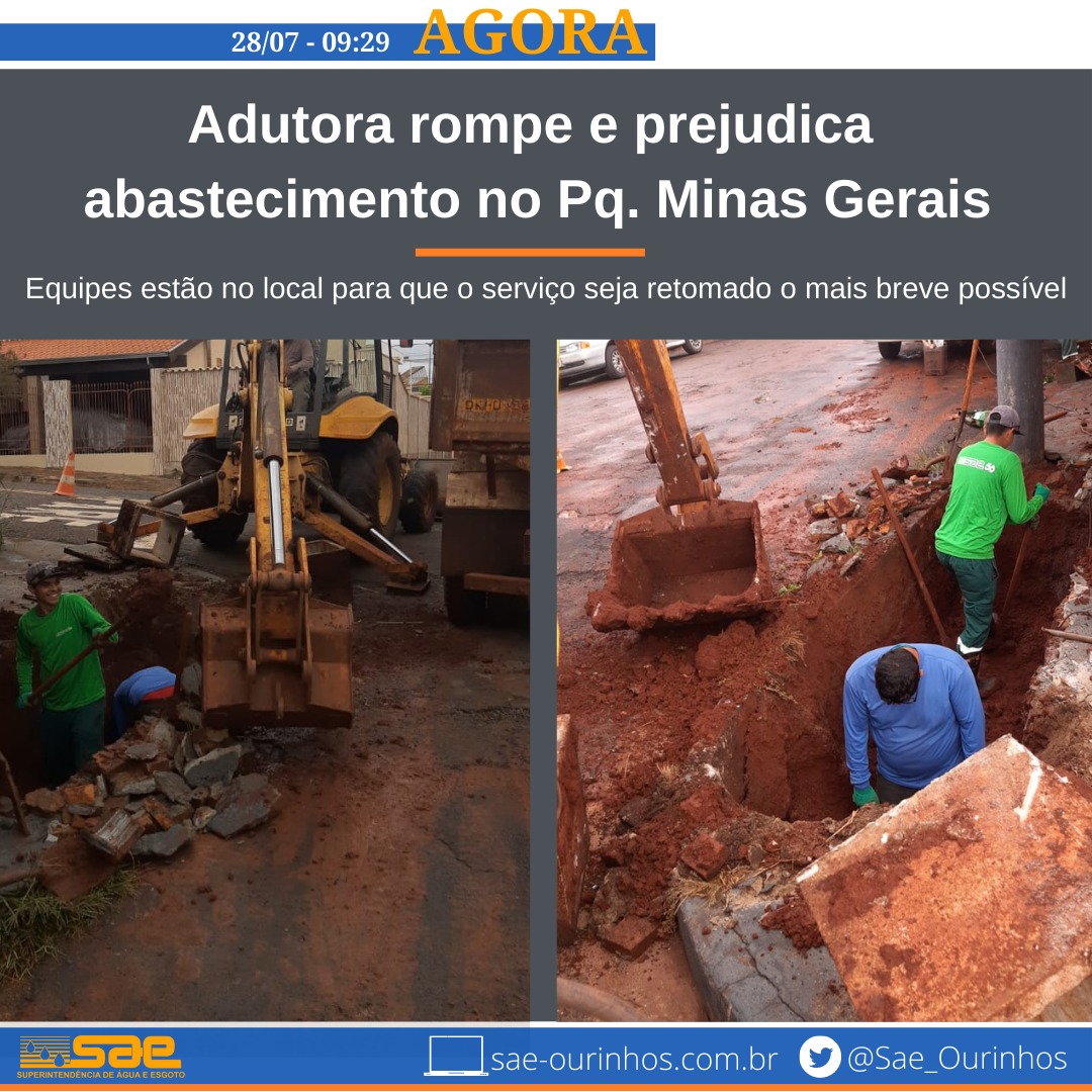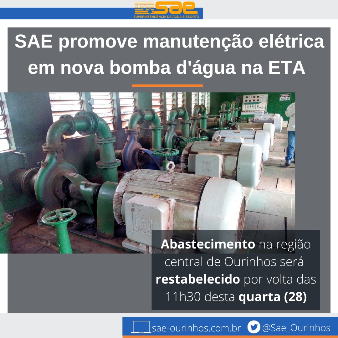 A SAE (Superintendência de Água e Esgoto de Ourinhos) informou, na manhã desta quarta-feira, 28, que está realizando a manutenção da bomba d’água da ETA (Estação de Tratamento de Água), com isso ficou prejudicado o abastecimento de água na área central de Ourinhos. Segundo a SAE, a normalização do serviço deve acontecer após às 11h30 de hoje (28).