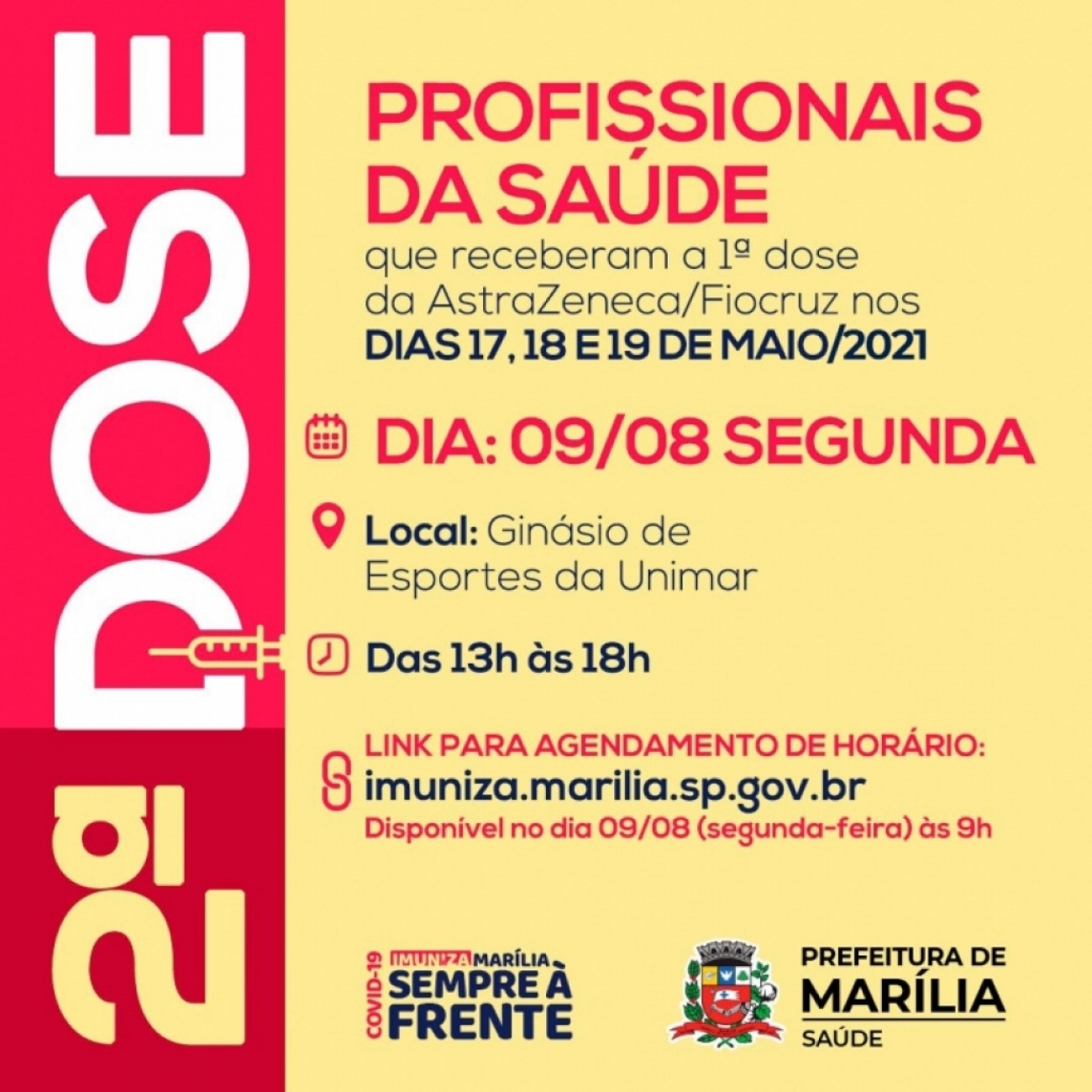 A Secretaria Municipal da Saúde de Marília agendou a aplicação da segunda dose da vacina contra a Covid-19 para os Profissionais da Saúde para a próxima segunda-feira, dia 9 de agosto, das 13h às 18h, no ginásio de esportes da Unimar (Universidade de Marília).
