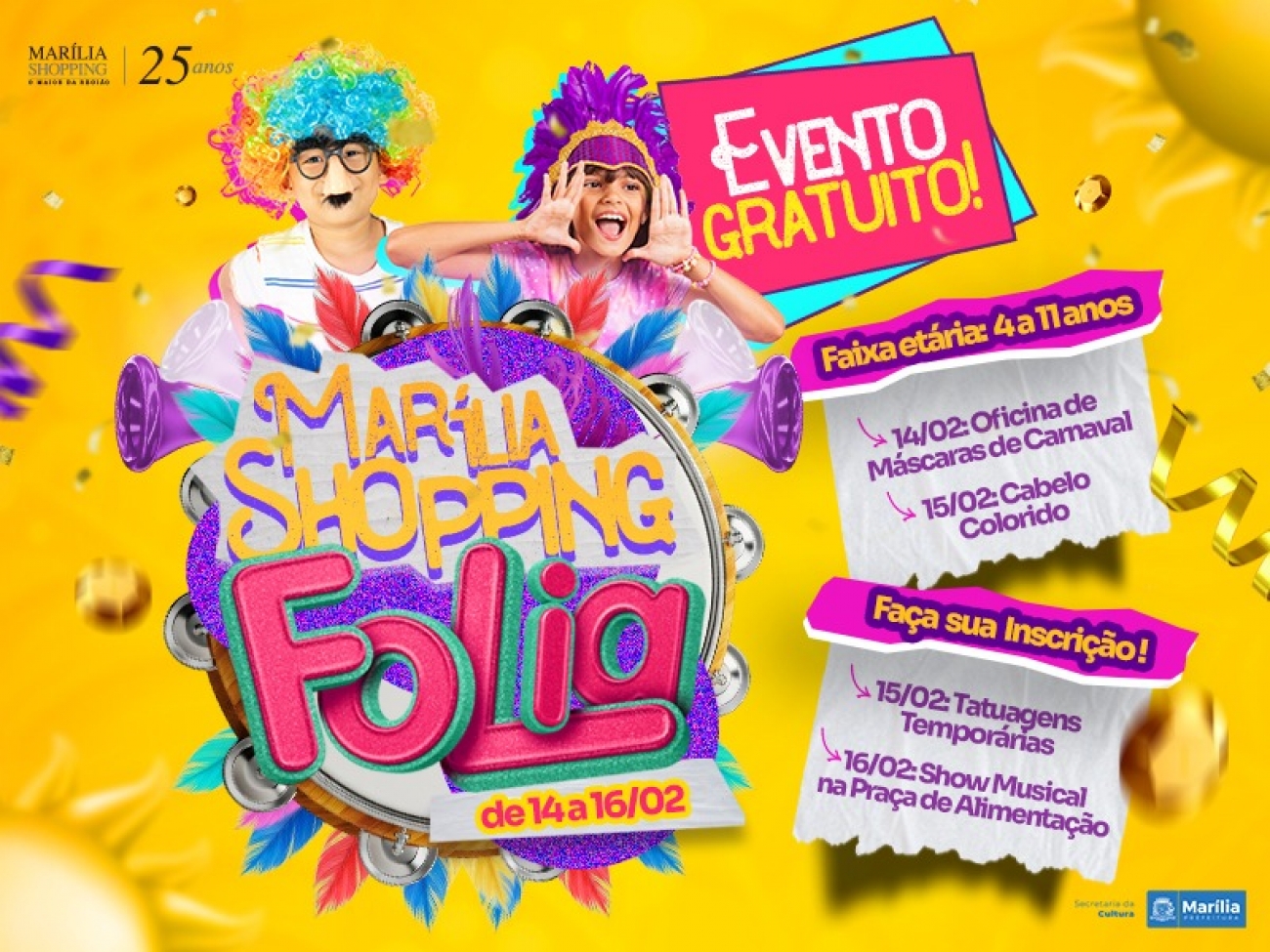 Gratuitas, as inscrições devem ser feitas pelo link: https://www.sympla.com.br/evento/marilia-shopping-folia/3306921