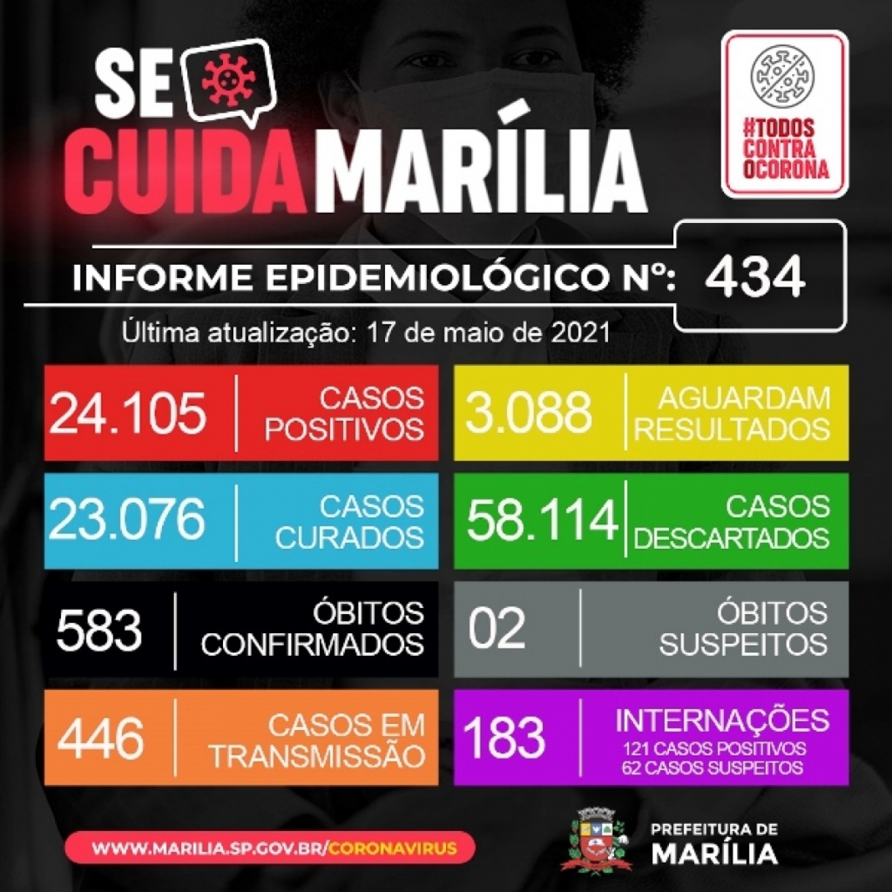 A Prefeitura de Marília confirmou na manhã desta segunda-feira, dia 17, mais 12 mortes por Covid-19. A cidade chega a 583 óbitos desde o início da epidemia, cem deles nos 17 dias de maio.