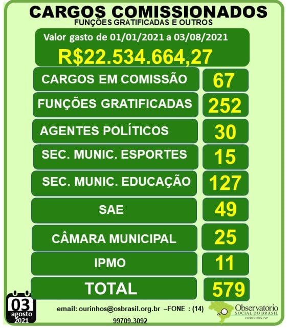 O Observatório Social de Ourinhos divulgou, nesta terça-feira, 4, a atualização, do que ficou conhecido como o “Boletim de Cargos de Confinça” da cidade, que atingiu a incrível marca de R$22.534.664,27, gastos com salários, dos sete primeiros meses, de Cargos Comissionados e “Funções de Confiança”, nomeados tanto na Prefeitura de Ourinhos, Secretaria Municipal de Esportes, como na Câmara Municipal, SAE (Superintendência de Água e Esgoto de Ourinhos) e no IPMO (Instituto de Previdência do Município de Ourinhos).