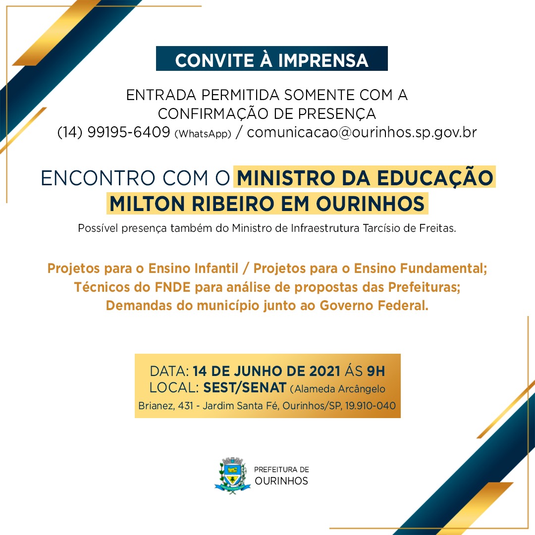 O ministro vai falar de projetos para o Ensino Infantil, Fundamental e técnico e também iria receber demandas do município junto ao Governo Federal. Confira o convite divulgado pela Prefeitura através de grupo no WhatsApp:
