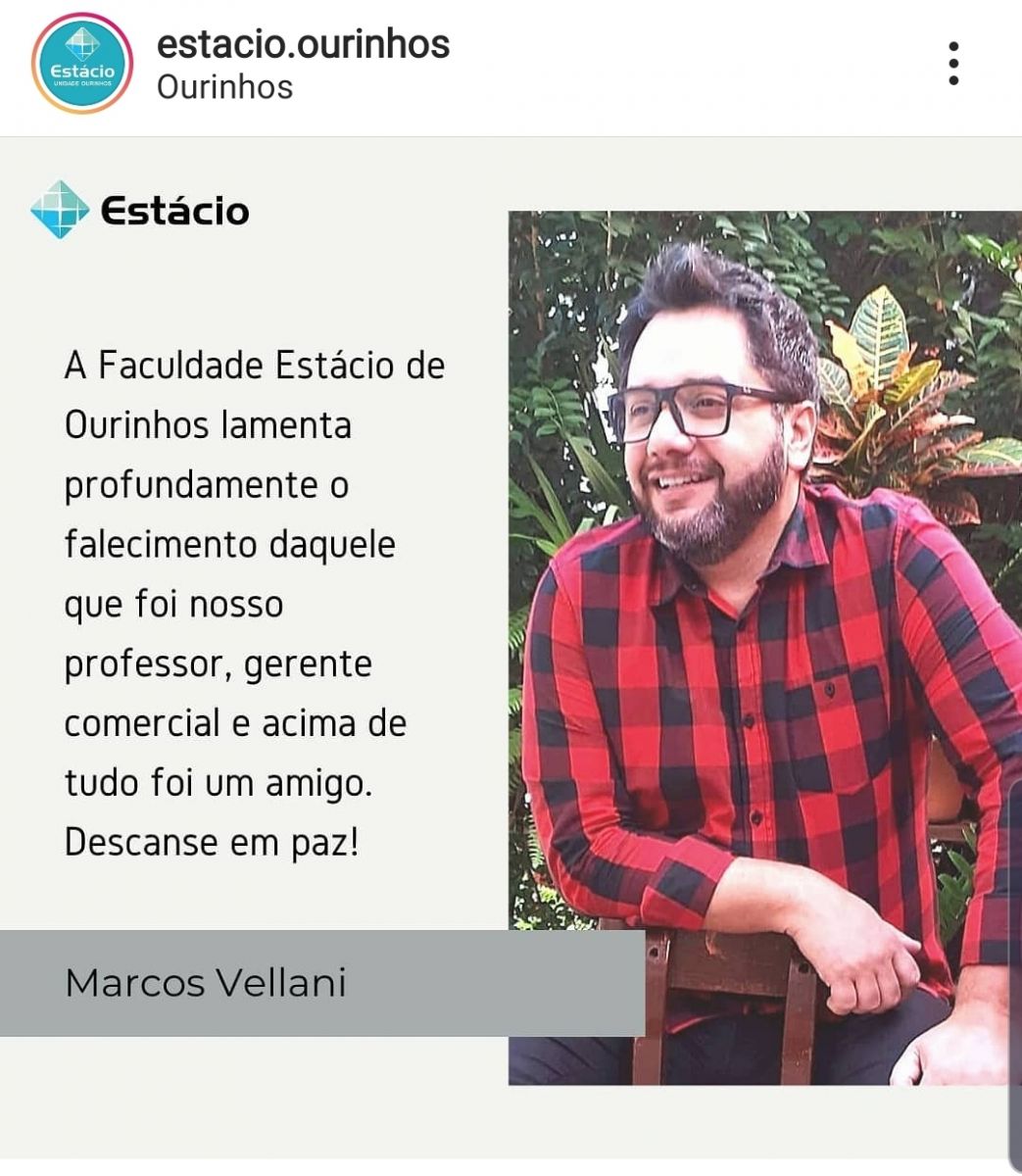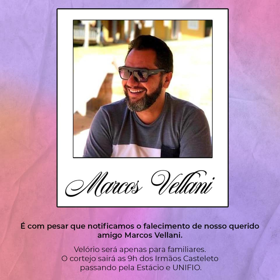 - Professor Marcos Roberto Rodrigues Vellani de 49 anos. Atuava na FIO (Faculdades Integradas de Ourinhos) e também trabalhou na Faculdade Estácio de Sá de Ourinhos e faleceu internado no hospital da Unimed. Está sendo velado no Centro velatório Irmãos Castelletto em Ourinhos e será levado à Itapeva (SP) às 10h30, onde será sepultado.