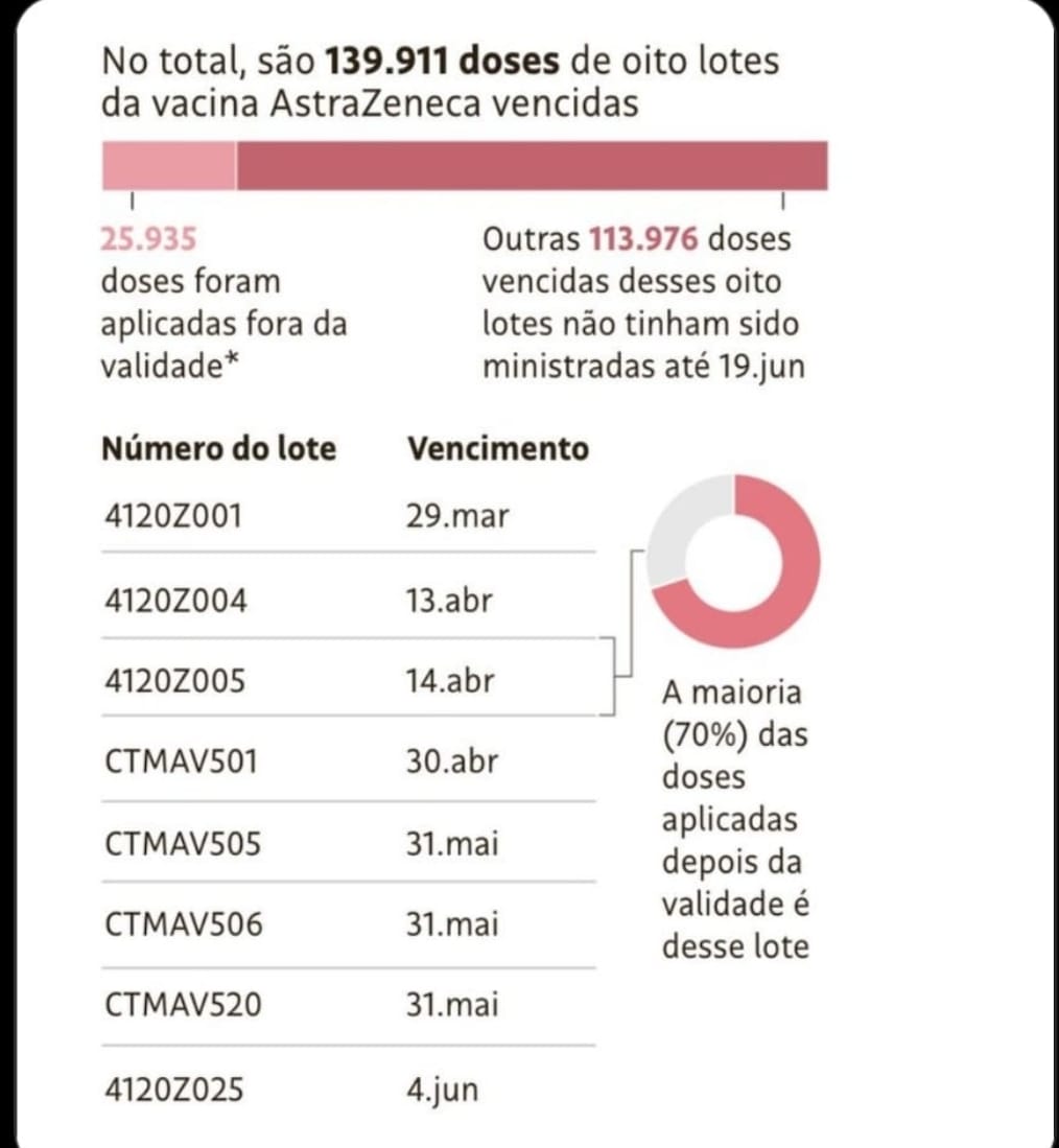 De acordo com matéria publicada, na tarde desta sexta-feira, 2, pelo jornal Folha de S.Paulo e site UOL, pelo menos 26 mil doses vencidas da vacina AstraZeneca no país, o que compromete sua proteção. Os dados de registros oficiais do Ministério da Saúde. Até o dia 19 de junho os imunizantes vencidos foram aplicados em pelo menos 1.532 municípios, entre eles, está a cidade de Ourinhos, com uma dose e outras quatro cidades da região.