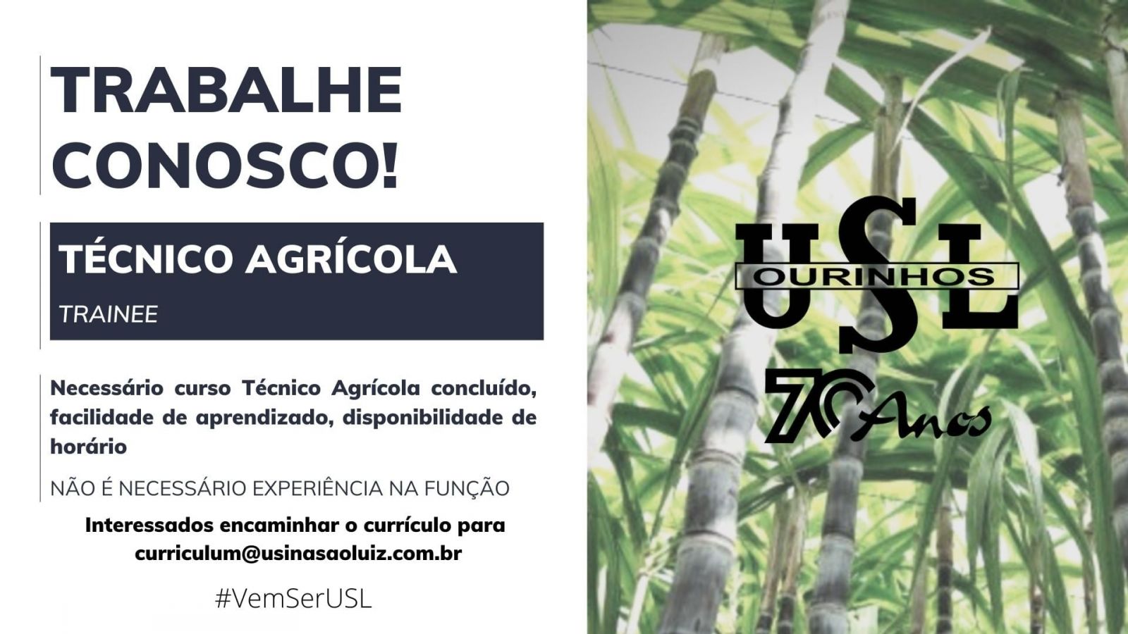 Interessados enviar currículo para o e-mail curriculum@usinasaoluiz.com.br com a sigla TECAGR no campo assunto.