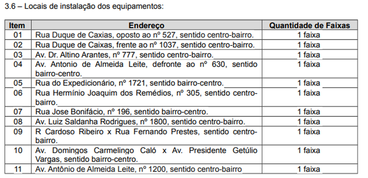 A empresa vai instalar e operar nos próximos dias 11 radares fixos, que deverão ser colocados nas seguintes vias do quadro abaixo. A Prefeitura deverá realizar ampla publicidade antes da operação iniciar.