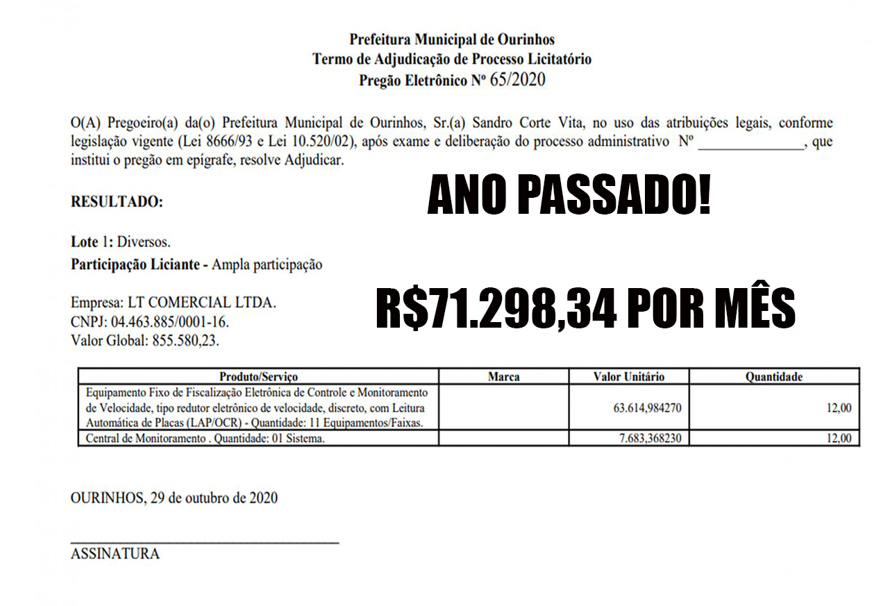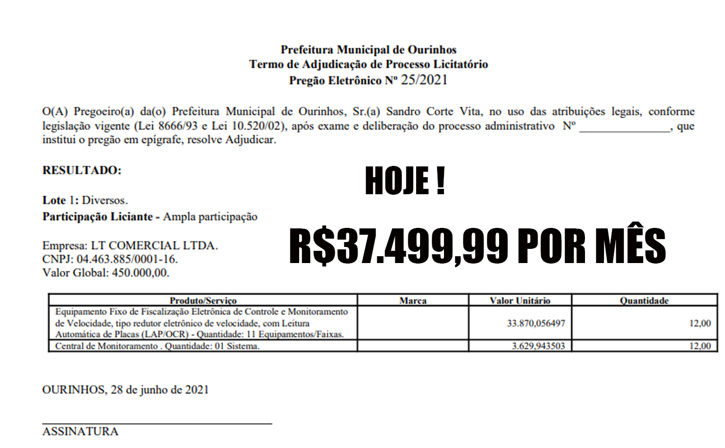 Depois de quase um ano sem radares fixos operando na cidade de Ourinhos, a Prefeitura publicou no Diário Oficial do Município, nesta terça-feira, 29, a contratação da empresa LT Comercial Ltda, de Araçoiaba da Serra (SP), a mesma empresa que operava os radares até o fim do contrato em julho do ano passado. O mais interessante é que esta mesma empresa, a LT Comercial Ltda, havia vencido no ano passado um novo pregão com o valor Global: R$855.580,23 (por ano) , que acabou anulado e desta vez vai cobrar quase a metade, R$450.000,00 por ano. Mostrando que o valor de mais R$1 milhão que a Prefeitura de Ourinhos orçou, realmente estava muito acima do mercado, como apontou uma empresa recentemente. Mesma empresa e mesmo objeto, mas valores muito distintos: