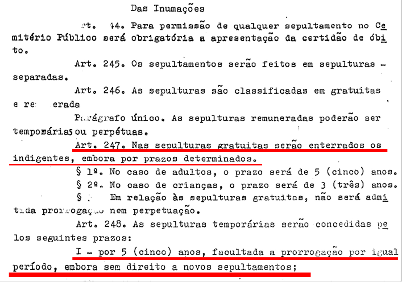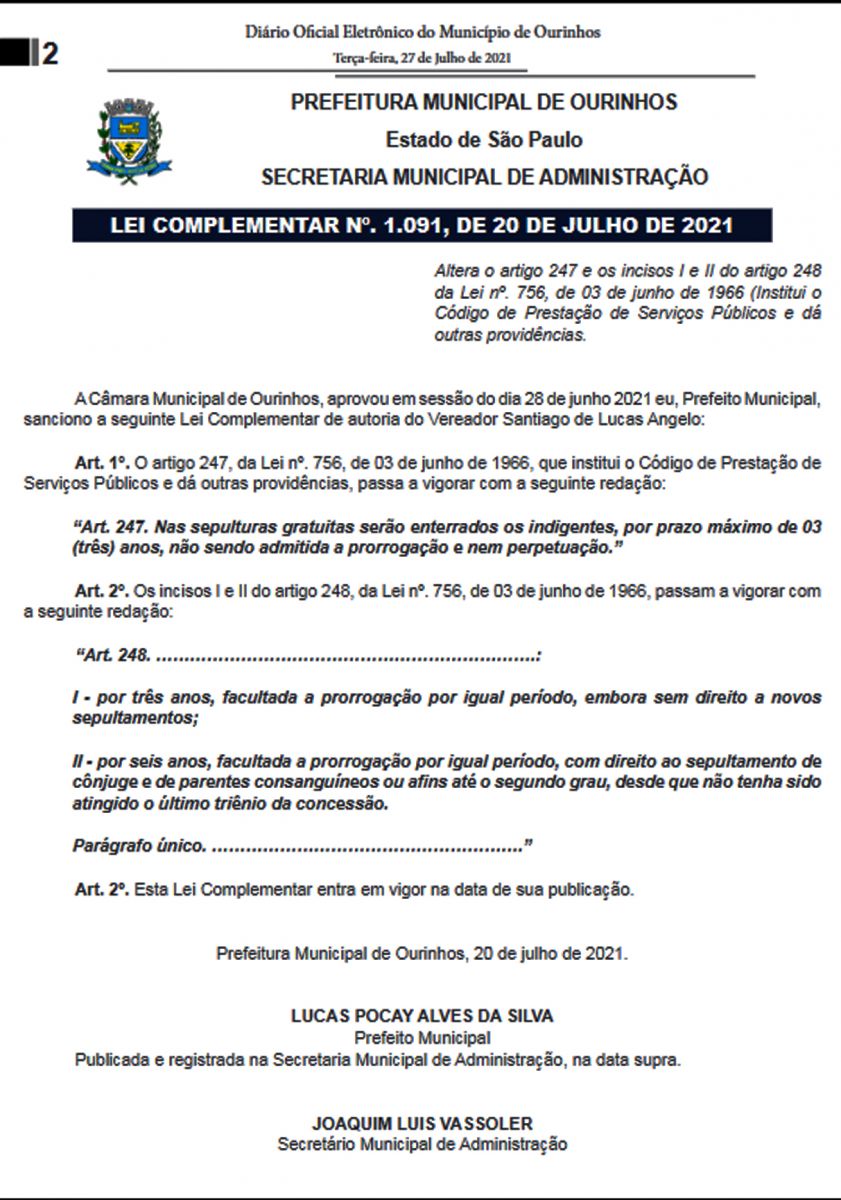 O prefeito de Ourinhos, Lucas Pocay (PSD), sancionou e publicou, nesta terça-feira, 27, no Diário Oficial do Municipal, a alteração do artigo 247 e dos incisos I e II do artigo 248 da Lei no. 756, de 03 de junho de 1966 (Institui o Código de Prestação de Serviços Públicos e dá outras providências). Basicamente, as alterações diminuem o prazo de concessão de sepulturas gratuitas do cemitério e ossadas de pessoas que foram sepultadas nestas sepulturas serão retiradas e o túmulo será repassado para outros sepultamentos. Confira abaixo com era e como vai ficar: