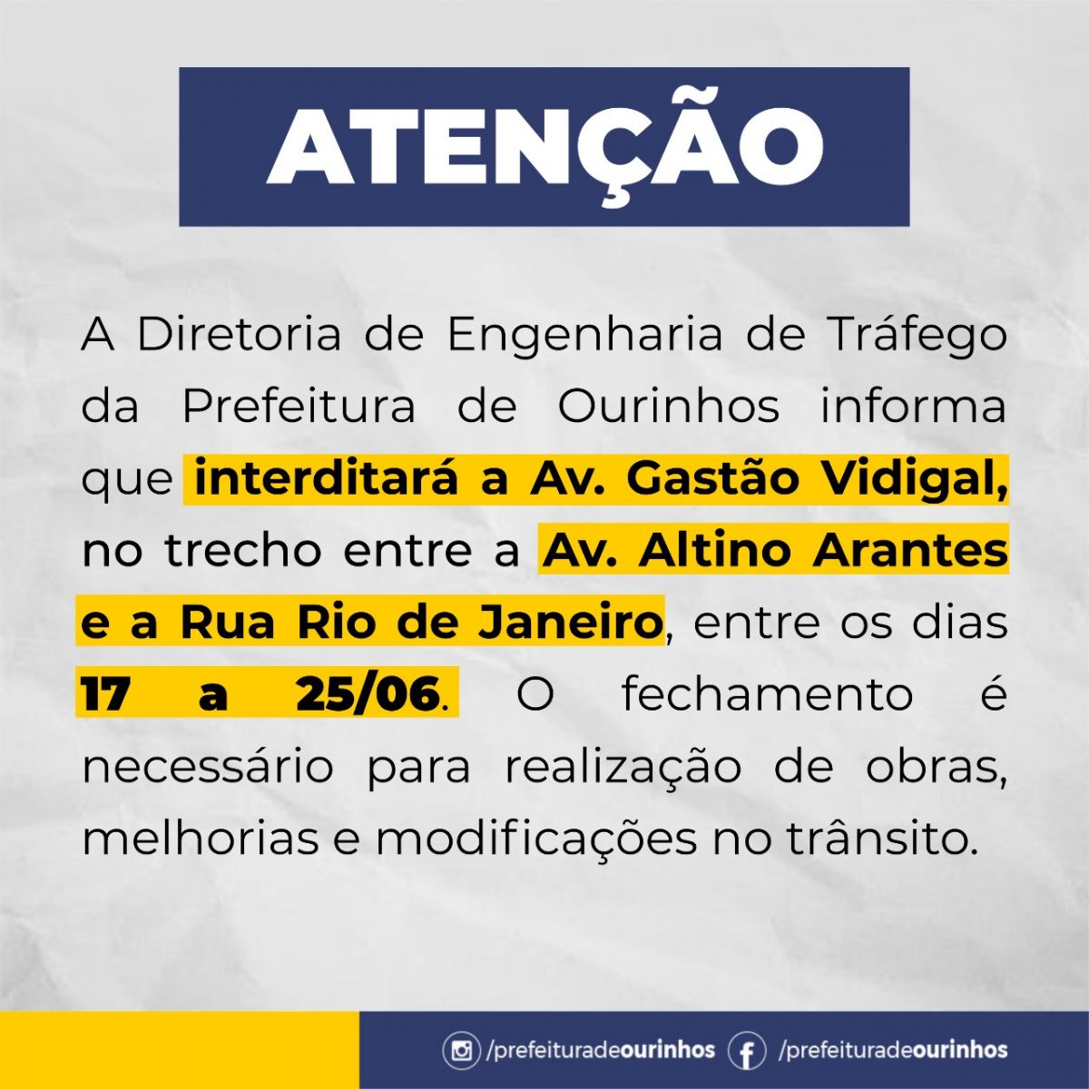 Somente às 15h55 o setor de comunicação nos informou que o trecho, que fica nas proximidades da rotatória que faz a interligação do Jardim Matilde e Vila São José. será interditado de hoje (17) até o dia 25 de junho (sexta-feira da próxima semana). Confira o aviso abaixo: