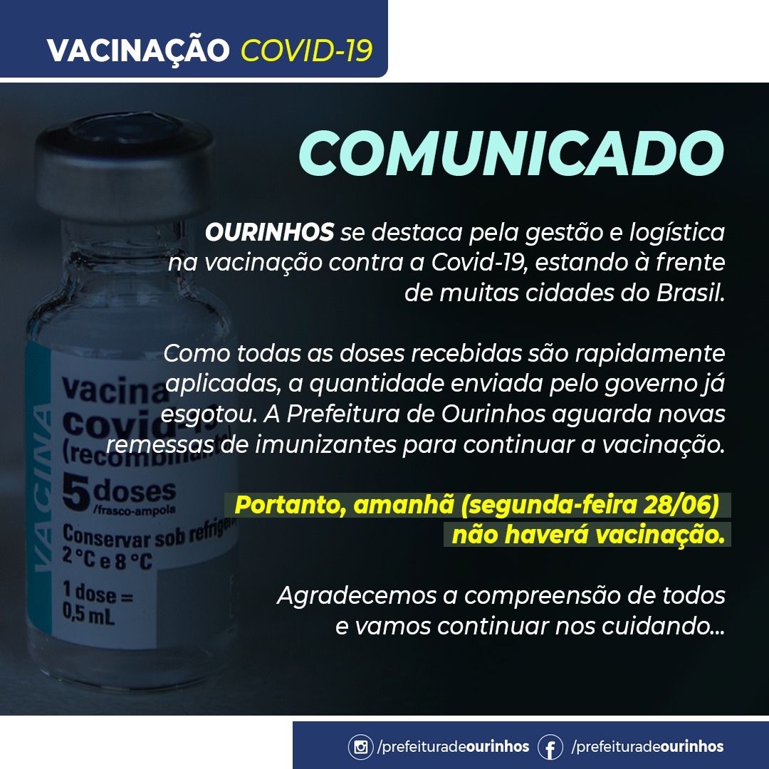 Em comunicado em suas redes sociais, a Prefeitura de Ourinhos, informou que não haverá nesta segunda-feira, 28, vacinação contra a Covid-19. Desde sexta-feira, 25, a campanha foi paralisada, após o município atingir a marca de 67.178 doses aplicadas, 51.455 de 1ª dose e 15.723 de 2ª dose (45% da população geral já recebeu a 1ª dose). De acordo com o comunicado, o motivo da paralisação é a falta de novas grades do imunizante. Confira o comunicado: