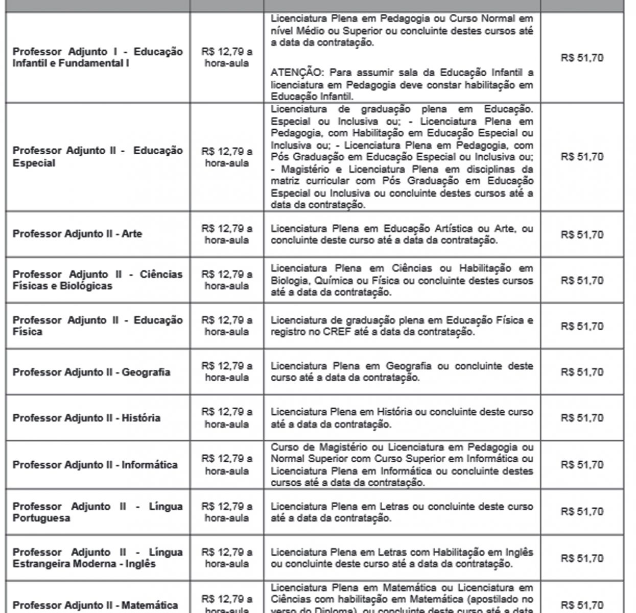 A Prefeitura de Ourinhos publicou, nesta sexta-feira, 23, no Diário Oficial do Município, o Edital nº 02/2021 do processo seletivo simplificado para contratar, de forma temporária, professores adjuntos I e II, de Educação Infantil e Fundamental I, Especial, Arte, Ciências, Educação Física, Geografia, História, Informática, Língua Portuguesa, Inglês e Matemática. Para os cargos os salários são iguais, de R$12,79 a hora-aula. A taxa de inscrição é de R$51,70.