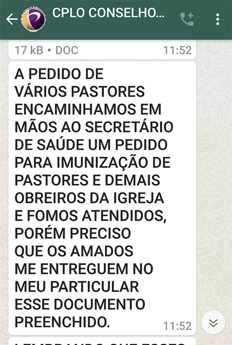 Já circula em grupos de pastores evangélicos de Ourinhos uma mensagem dizendo que a Secretaria Municipal de Saúde já atendeu ao pedido e os religiosos estão preenchendo um documento para a realização de um cadastro prévio para receber o imunizante.