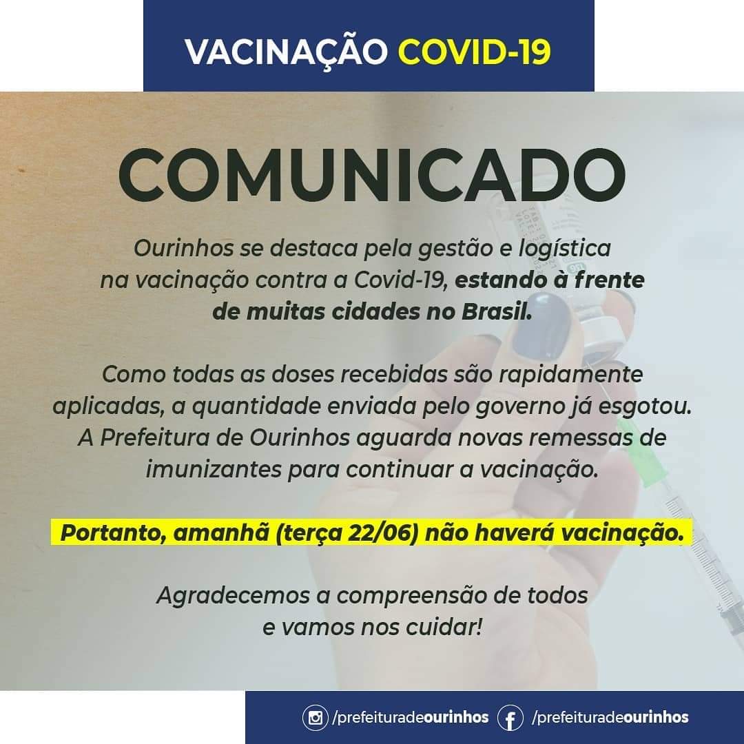 A Prefeitura de Ourinhos informou na noite desta segunda-feira, 21, que por falta de vacinas, não terá vacinação contra a Covid-19 nesta terça-feira, 22. A Prefeitura não informou quando deverão chegar novos lotes para retomar a acinação:
