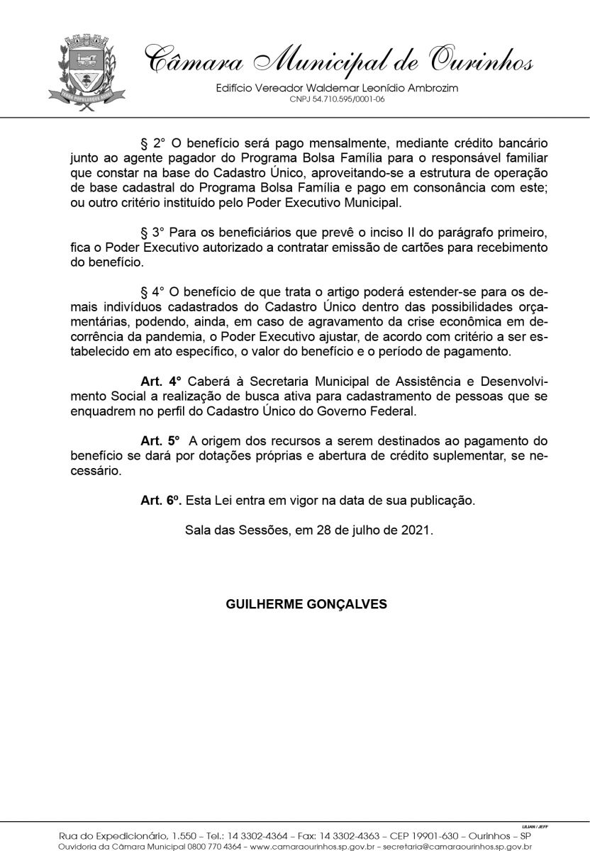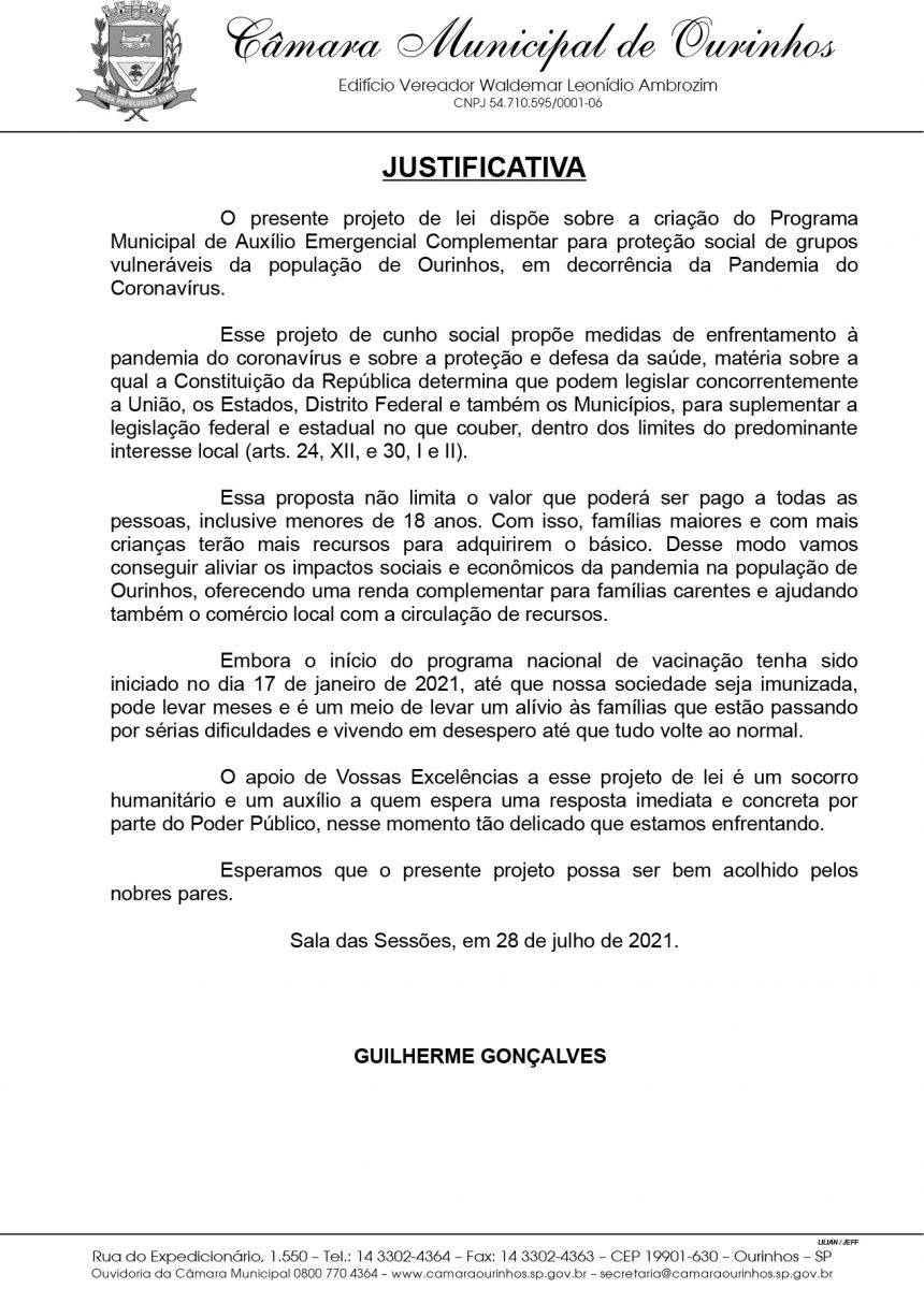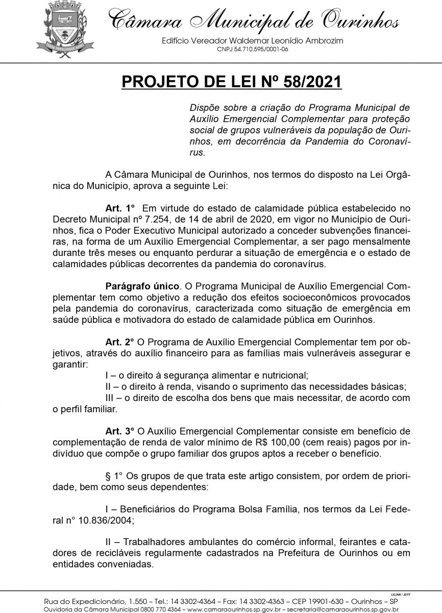 O Projeto de Lei nº 58/2021, que cria o Programa Municipal de Auxílio Emergencial Complementar para proteção social de grupos vulneráveis da população de Ourinhos, em decorrência da Pandemia do Coronavírus, de autoria do vereador Guilherme Gonçalves (PODE) está na pauta da sessão da Câmara, desta segunda-feira, 2 e poderá entrar em votação.