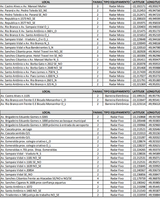 O edital estabelece diferentes condições técnicas para as 98 faixas a serem implantadas. Serão contratados radares fixos, radares com display (conhecidos como lombadas eletrônicas), equipamentos mistos com os dois sistemas e dois estáticos, que podem ser utilizados em diferentes pontos da cidade.