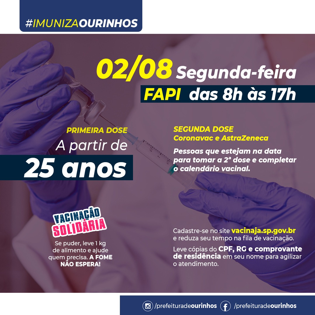 Depois de ficar mais de uma semana aplicando a 1ª dose em pessoas de 26 anos ou mais, a Prefeitura de Ourinhos, anunciou neste domingo (1º), que vai vacinar contra a Covid-19, jovens de 25 anos, ou mais com a 1ª dose do imunizante, nesta segunda-feira, 2, a partir das 8h, até às 17h, na Fapi. Continua aplicação da 2ª dose, tanto da AstraZeneca, como da CoronaVac.